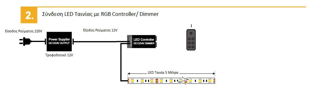 Σύνδεση LED Ταινίας με RGB Controller / Dimmer, μπορείτε να δείτε το σχεδιάγραμμα 2.