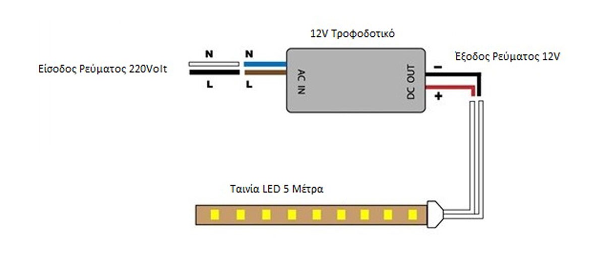 Για την σύνδεση 5 Μέτρων της Ταινίας LED με το τροφοδοτικό μπορείτε να δείτε το ακόλουθο σχεδιάγραμμα.