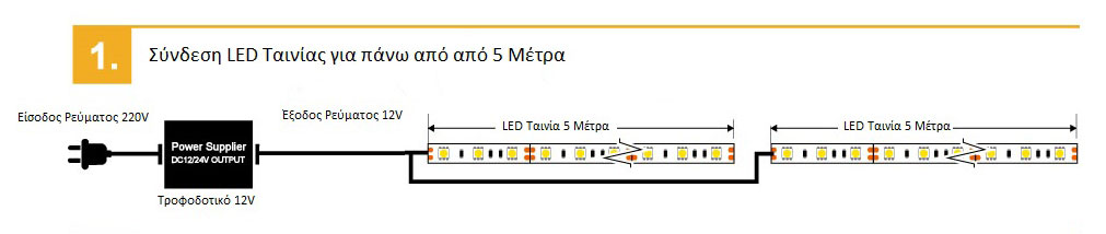 Μπορείτε να συνδέσετε πάνω από 5 Μέτρα LED ταινίας σε ένα τροφοδοτικό.