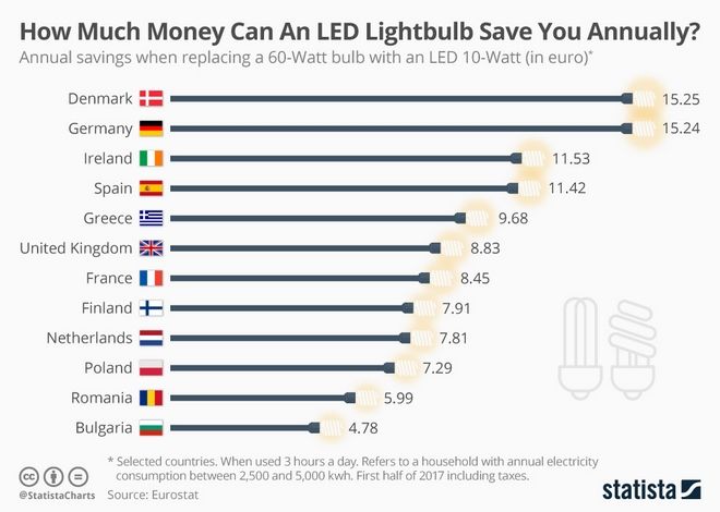 Πριν από λίγες ημέρες η Eurostat δημιούργησε έναν πίνακα. Όπου δείχνει το ετήσιο όφελος που έχουν τα νοικοκυριά στην Ευρώπη. Εάν αντικαταστήσουν μία παραδοσιακή λάμπα των 60 Watt με μία LED των 10 Watt.