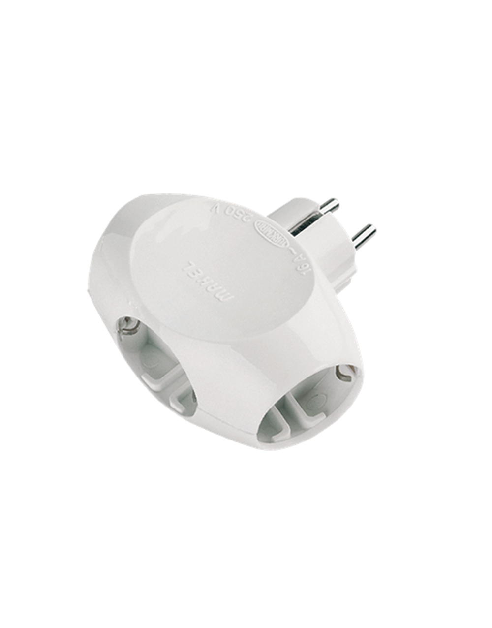 Αντάπταρας σε σούκο τριπλός σε σταυρό. Έχει τάση τροφοδοσίας 250V, συχνότητα λειταυργίας 50/60Hz και ένταση ρεύματας 16Α. Διαθέτει προστασία επαφών. Είναι σε λευκό χρώμα και τα υλικά κατασκευής είναι πλαστικό και χαλκός. Ο βαθμός στεγανότητας είναι IP20 και η εγγύηση είναι 2 έτη από την Makel.