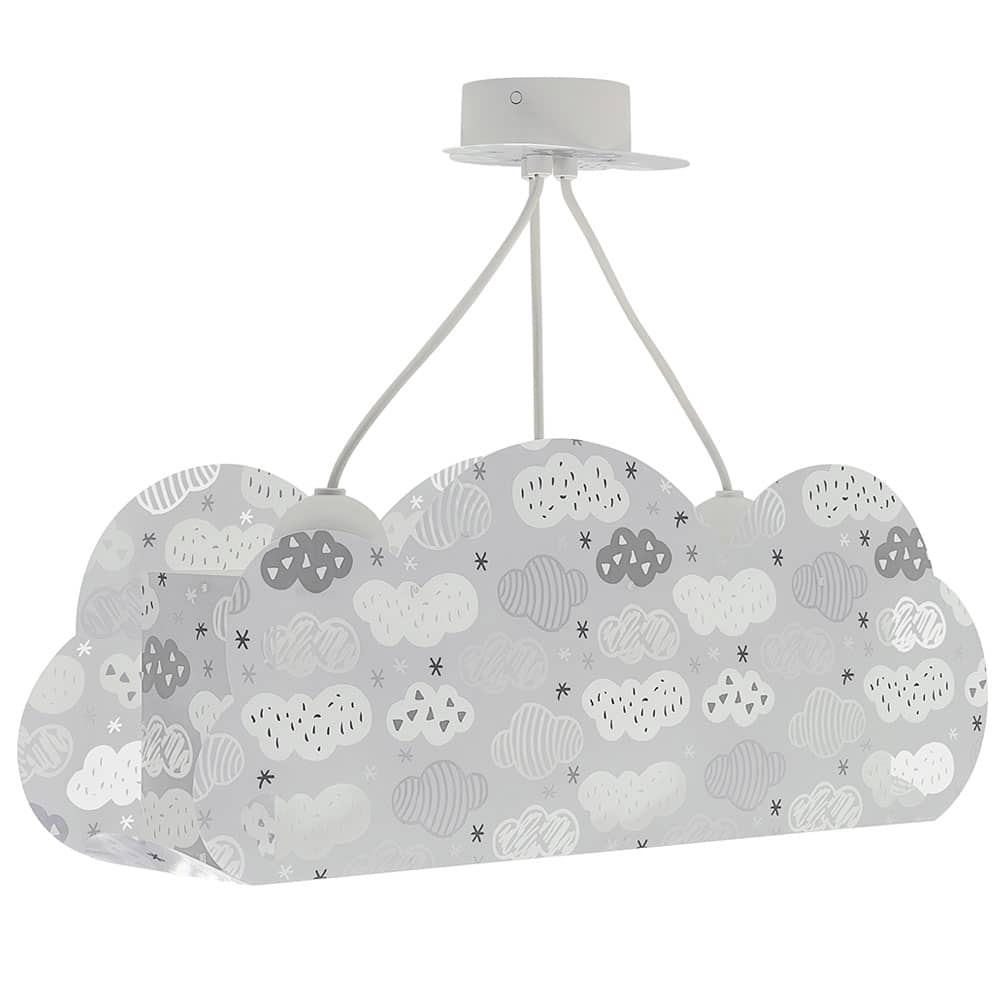 Μοντέρνα, κατασκευή σε σχήμα σύννεφου με τρία φωτεινά σώματα και ανάλογες θέσεις λαμπτήρων. Κατάλληλο για τον γενικό φωτισμό του δωματίου, είναι διπλού τοιχώματος από λεπτό διάφανο πολυπροπυλένιο, προσφέροντας άπλετο φως χωρίς σκιές, διασκεδαστικό χαρακτήρα και χρώμα σε κάθε σημείο του χώρου. Απόλυτα ασφαλές ώστε τα παιδιά να μπορούν να μελετήσουν, να παίξουν και να κοιμηθούν παρέα με το αγαπημένο τους θέμα. Κατασκευάζεται εξ ολοκλήρου στην Ευρώπη και συμπληρώνει τα υπόλοιπα παιδικά φωτιστικά της συλλογής.