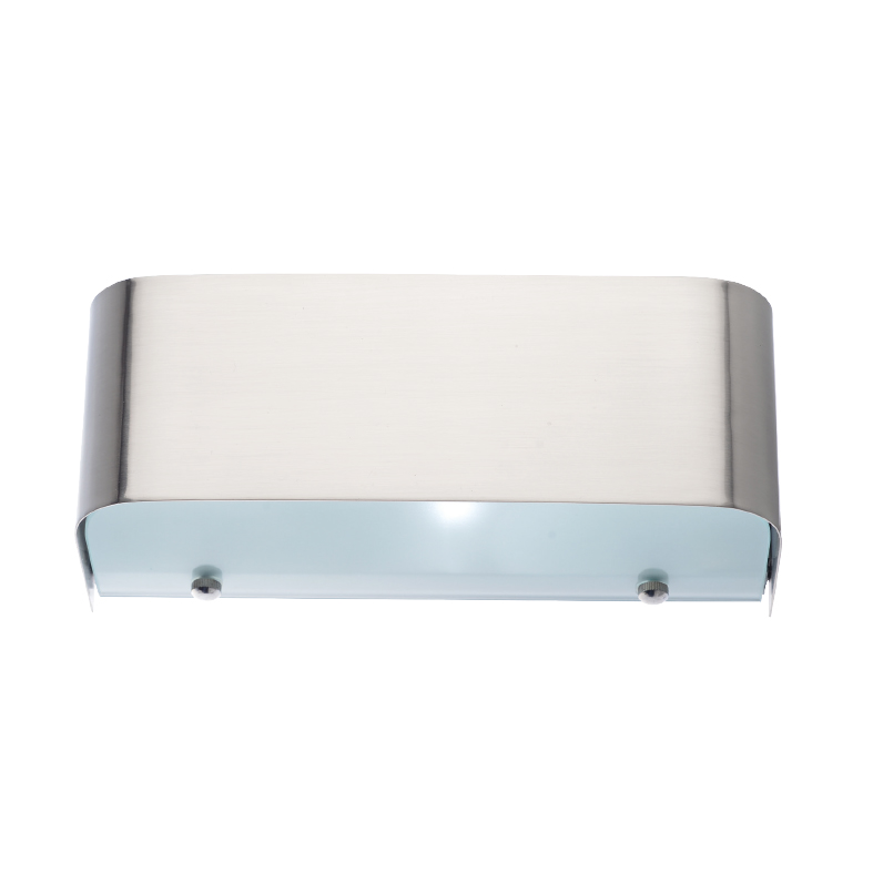 Μεταλλικό ορθογώνιο φωτιστικό τοίχου διακοσμημένο με γυαλί αμμοβολής πάνω & κάτω και διάχυση φωτισμού πάνω & κάτω. Metallic rectangle wall lighting fi xture decorated with up & down sandblasted glass and diff usion lighting up & down