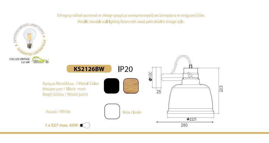 Απλίκα Μεταλλική 1ΧE27 Μαύρη & Απόχρωση Ξύλου ACA – KS2126BW