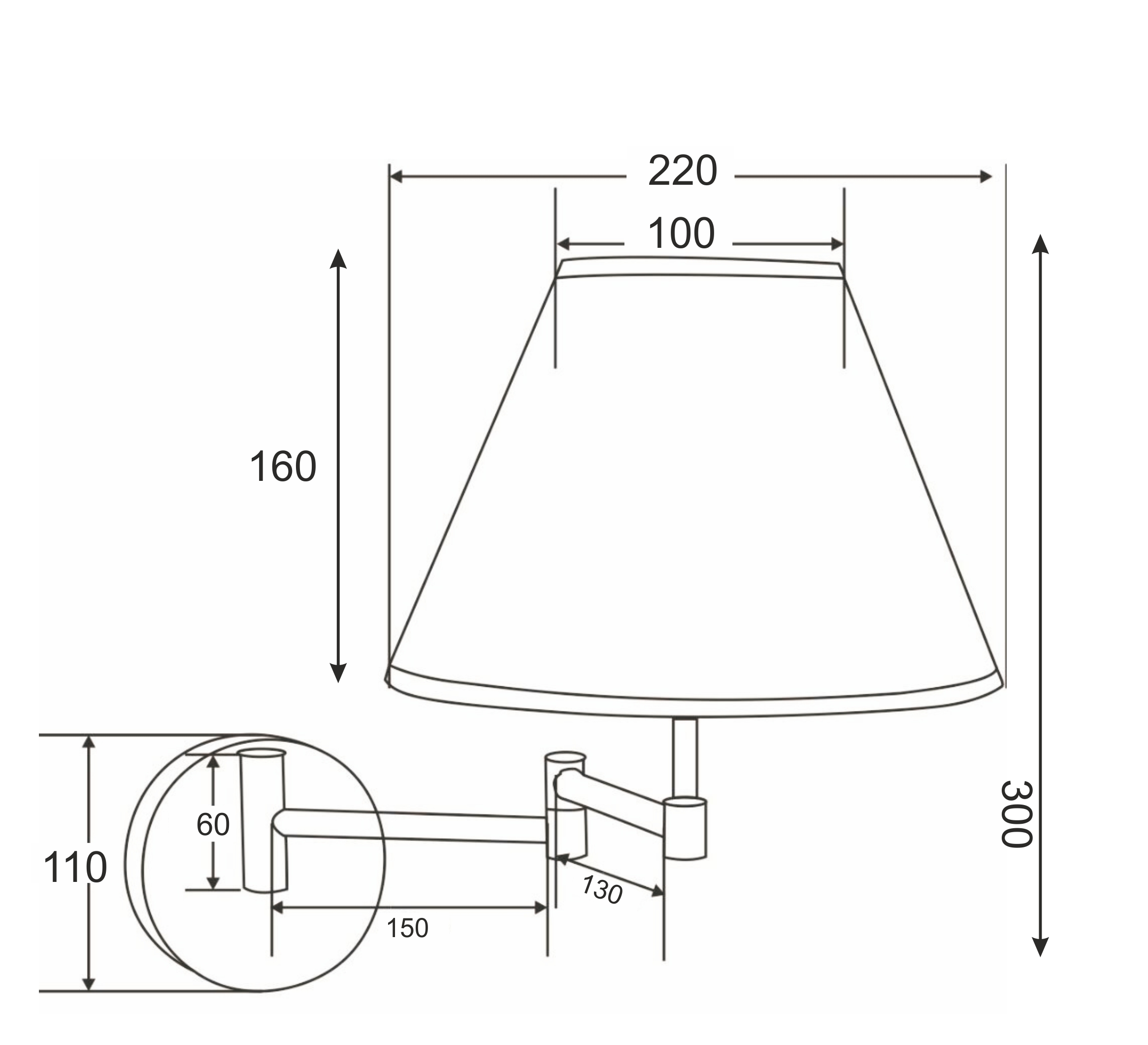 Μεταλλική χρώμιο απλίκα διακοσμημένη με υφασμάτινο καπέλο επενδυμένο εσωτερικά με λευκό κάλυμμα και μαύρο διακόπτη στη βάση.