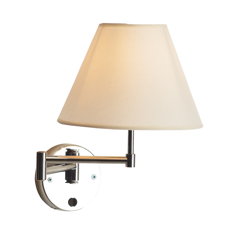 Metallic chrome wall lamp decorated with fabric shade lined internally with a white cover and black switch on the base.