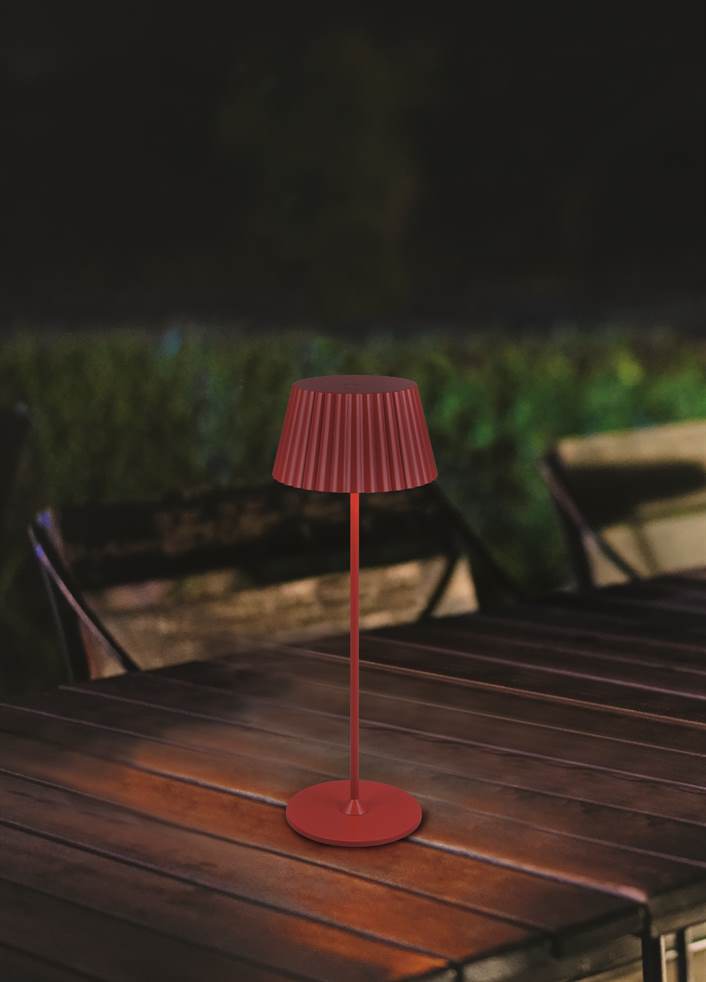 Η επαναφορτιζόμενη λάμπα SUAREZ LED κατασκευασμένη από μέταλλο υψηλής ποιότητας όχι μόνο παράγει ευχάριστο φως, αλλά είναι επίσης ένα πραγματικό μάτι. Η ένταση του φωτός μπορεί να ρυθμιστεί σε τρία στάδια χρησιμοποιώντας το ροοστάτη αφής στο επάνω μέρος της κεφαλής της λάμπας. Για να επαναφορτίσετε το φως, απλώς τοποθετήστε το στο σταθμό φόρτισης. Είτε σε εσωτερικό είτε σε εξωτερικό χώρο, μπορεί να χρησιμοποιηθεί οπουδήποτε χάρη στην προστασία IP44. Ιδανικός σύντροφος για μεγάλες καλοκαιρινές βραδιές στο αίθριο! Ο απλός σχεδιασμός του σε κόκκινα σύνολα δίνει διακοσμητικές πινελιές με έναν ευχάριστο χαρακτήρα. Το φωτιστικό διαθέτει επίσης σύγχρονη τεχνολογία LED, η οποία χαρακτηρίζεται από υψηλή ποιότητα φωτισμού και ενεργειακή απόδοση. Σε σύγκριση με τις συμβατικές πηγές φωτός αλογόνου, μπορεί να εξοικονομηθεί έως και το 80% του ενεργειακού κόστους. Με τις πηγές φωτός LED, επωφεληθείτε επίσης από τη μεγάλη διάρκεια ζωής και τη χαμηλή παραγωγή θερμότητας προστατεύοντας παράλληλα το περιβάλλον.