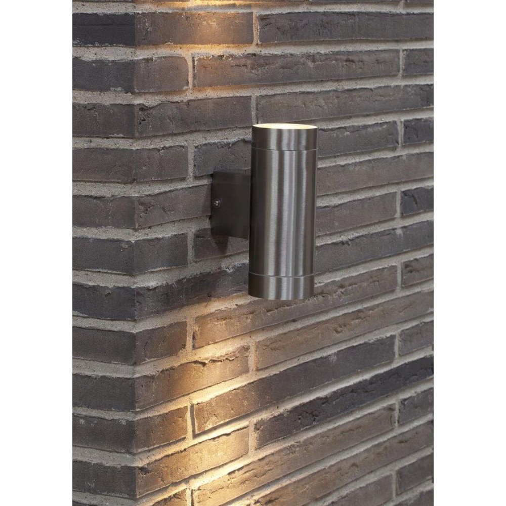 Επίτοιχο φωτιστικό απλίκα εξωτερικού χώρου από ανοξείδωτο ατσάλι σε χρώμα ασημί με διπλή κατεύθυνση φωτισμού πάνω-κάτω. Διαθέτει δύο λαμπτήρες LED GU10 με ισχύ έως 12W.