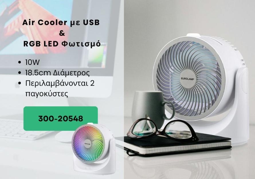 Απολαύστε ένα δροσερό και ευχάριστο περιβάλλον όπου κι αν βρίσκεστε. Το ΕΠΙΤΡΑΠΕΖΙΟ AIR COOLER της Eurolamp προσφέρει άμεση ανακούφιση από τη ζέστη, ενώ παράλληλα δημιουργεί μια χαλαρωτική ατμόσφαιρα με τον ενσωματωμένο RGB φωτισμό. Η τροφοδοσία μέσω USB το καθιστά εξαιρετικά εύχρηστο, καθώς μπορεί να συνδεθεί σε οποιαδήποτε θύρα USB, όπως σε υπολογιστή, power bank ή φορτιστή.