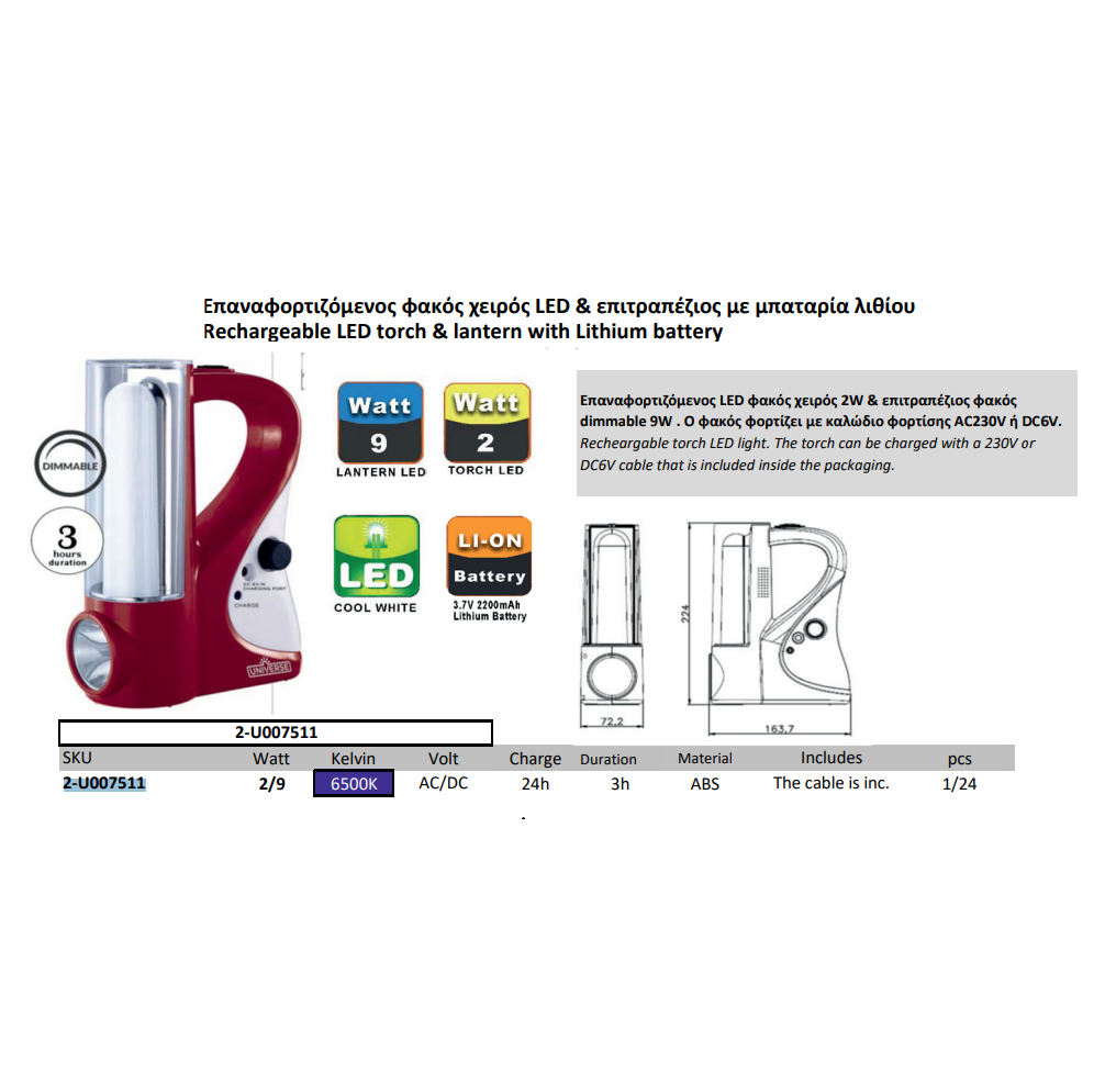 ΦΑΚΟΣ LED ΧΕΙΡΟΣ SMD 2W & ΕΠΙΤΡΑΠΕΖΙΟΣ DIMMABLE 9W 6500Κ AC230V/DC6V ΕΠΑΝΑΦΟΡΤΙΖΟΜΕΝΟΣ ΜΕ ΜΠΑΤΑΡΙΑ Li-ion UNIVERSE – 2-U007511