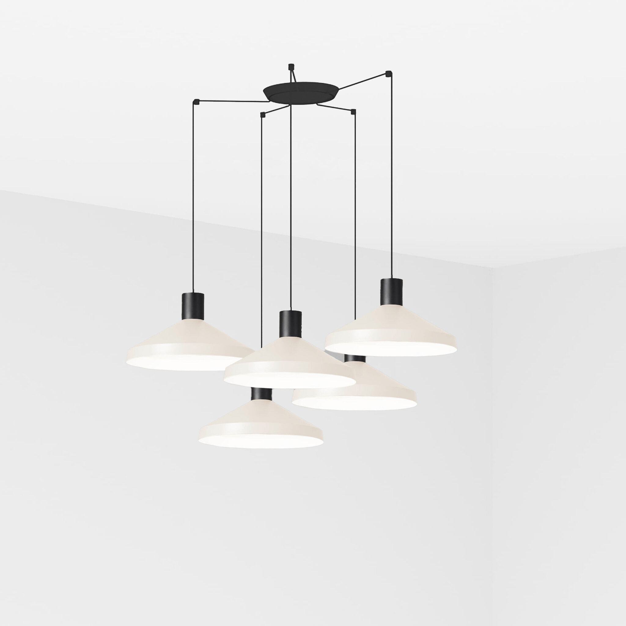 Το KOMBO είναι μια οικογένεια κρεμαστών φωτιστικών που δημιουργήθηκε από τη Nutcreatives. Η σειρά έχει διαφορετικά μεγέθη και φινιρίσματα που μοιράζονται μια μαύρη κυλινδρική δομή στο επάνω μέρος. Η απόχρωση αυτού του μπεζ φωτιστικού είναι κατασκευασμένη από μέταλλο, έχει μινιμαλιστικό στυλ και παίζει με γεωμετρικά σχήματα. Έκδοση με πολλαπλό 5φωτο θόλο. Έχει διάμετρο 40 cm.
