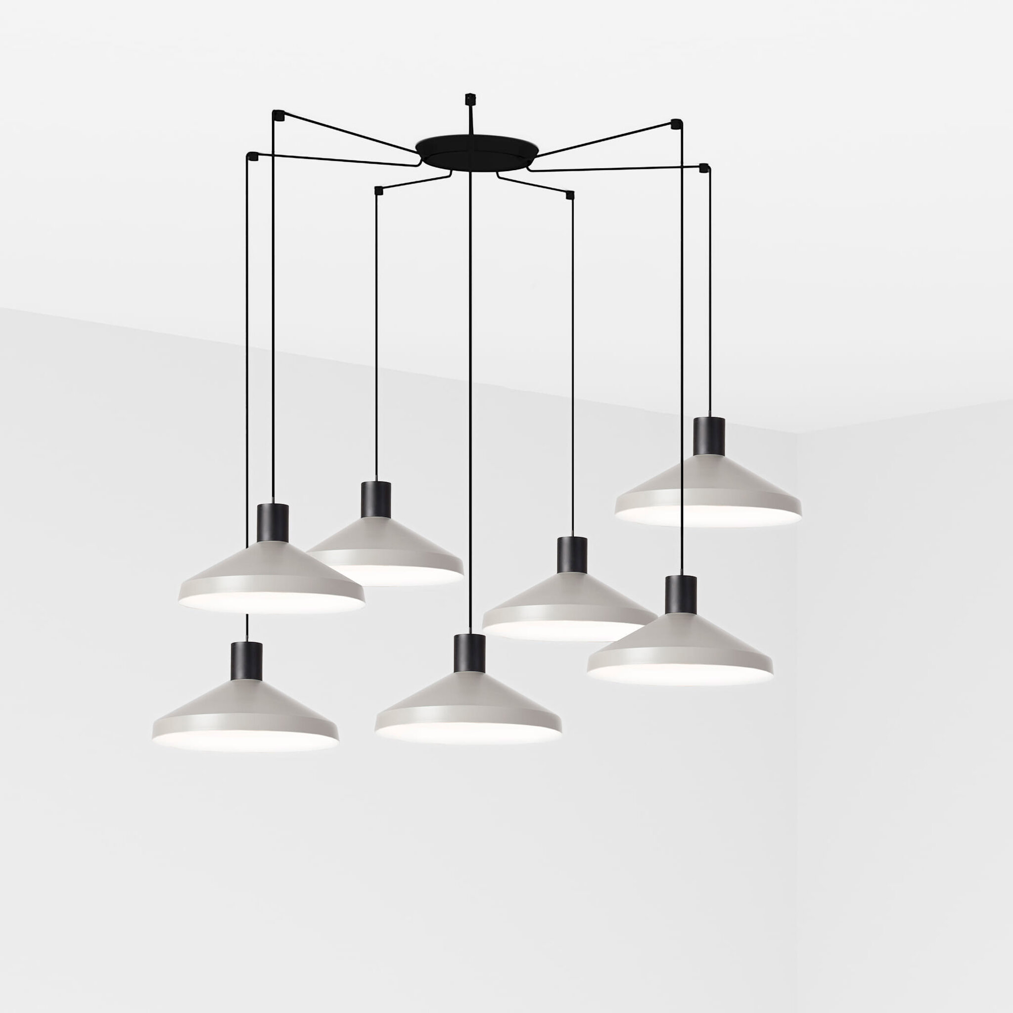 Το KOMBO είναι μια οικογένεια κρεμαστών φωτιστικών που δημιουργήθηκε από τη Nutcreatives. Η σειρά έχει διαφορετικά μεγέθη και φινιρίσματα που μοιράζονται μια μαύρη κυλινδρική δομή στο επάνω μέρος. Η απόχρωση αυτού του γκρι φωτός είναι κατασκευασμένη από μέταλλο, έχει μινιμαλιστικό στυλ και παίζει με γεωμετρικά σχήματα. Έκδοση με πολλαπλό 7φωτο θόλο. Έχει διάμετρο 40 cm.