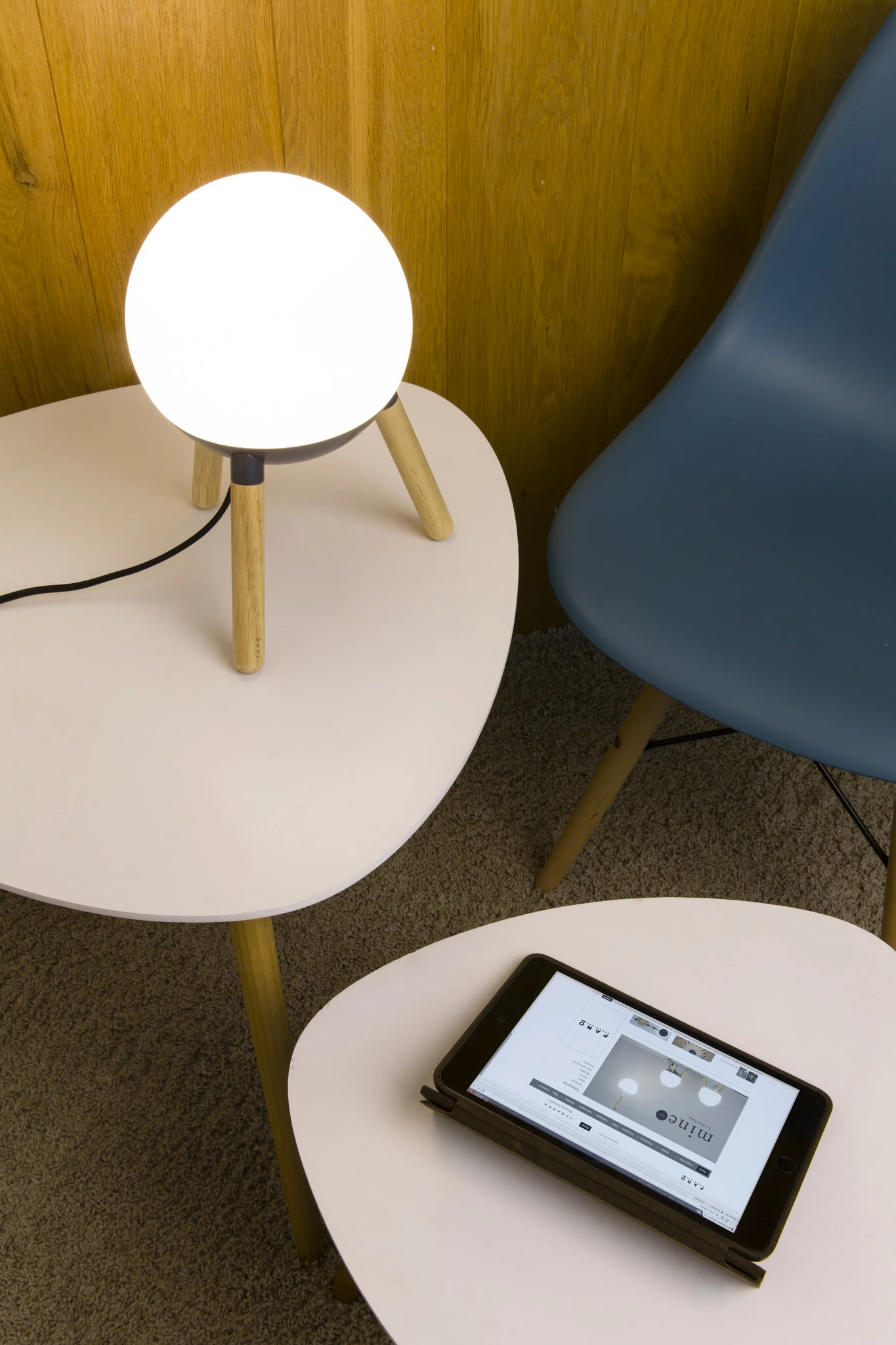 Γκρι επιτραπέζιο φωτιστικό με ξυλώδη δομή και γυάλινο διαχυτικό σχεδιασμένο από την Nahtrang. Το υλικό και το φως δίνουν μια ζεστή και άνετη πινελιά.
