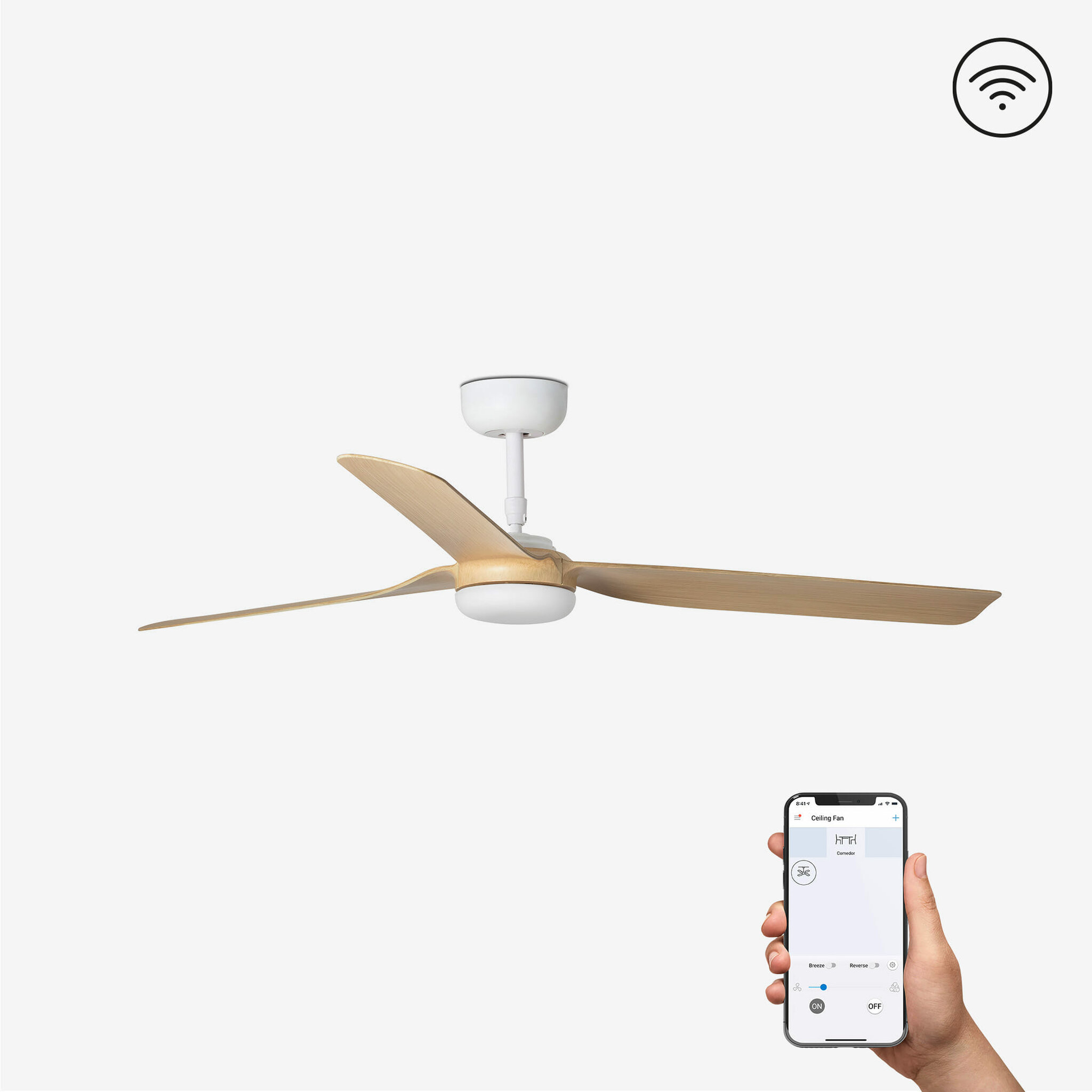Ελέγξτε τον ανεμιστήρα σας με την εφαρμογή WiZ. Αυτό το έξυπνο χειριστήριο έχει τις ίδιες λειτουργίες με ένα τηλεχειριστήριο. Λειτουργεί με WIFI 2,4 GHz. Είναι συμβατό με Alexa, Google Assistant και Siri.