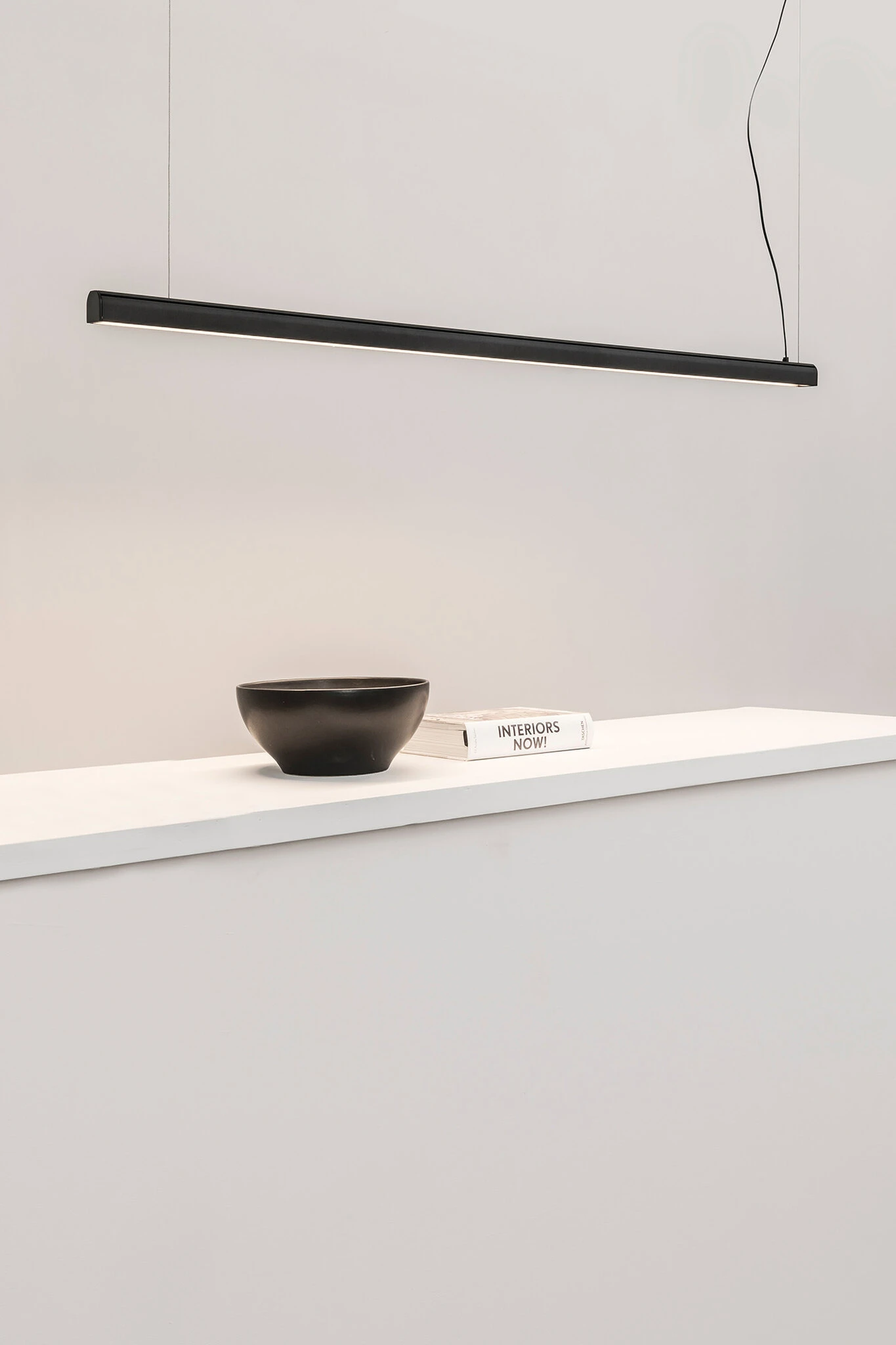Το VICO είναι ένα πολύ μοντέρνο, μινιμαλιστικό στυλ, μαύρο κρεμαστό φωτιστικό. Η συλλογή σάς επιτρέπει να επιλέξετε από δύο μήκη και είτε να αφήσετε το στέγαστρο ορατό είτε να το εγκαταστήσετε ως λαμπτήρα σε εσοχή. Αυτή είναι η έκδοση 115 cm με το κουβούκλιο σε εσοχή. Ιδανικό για όλους τους τύπους εσωτερικών χώρων όπως τραπεζαρίες.