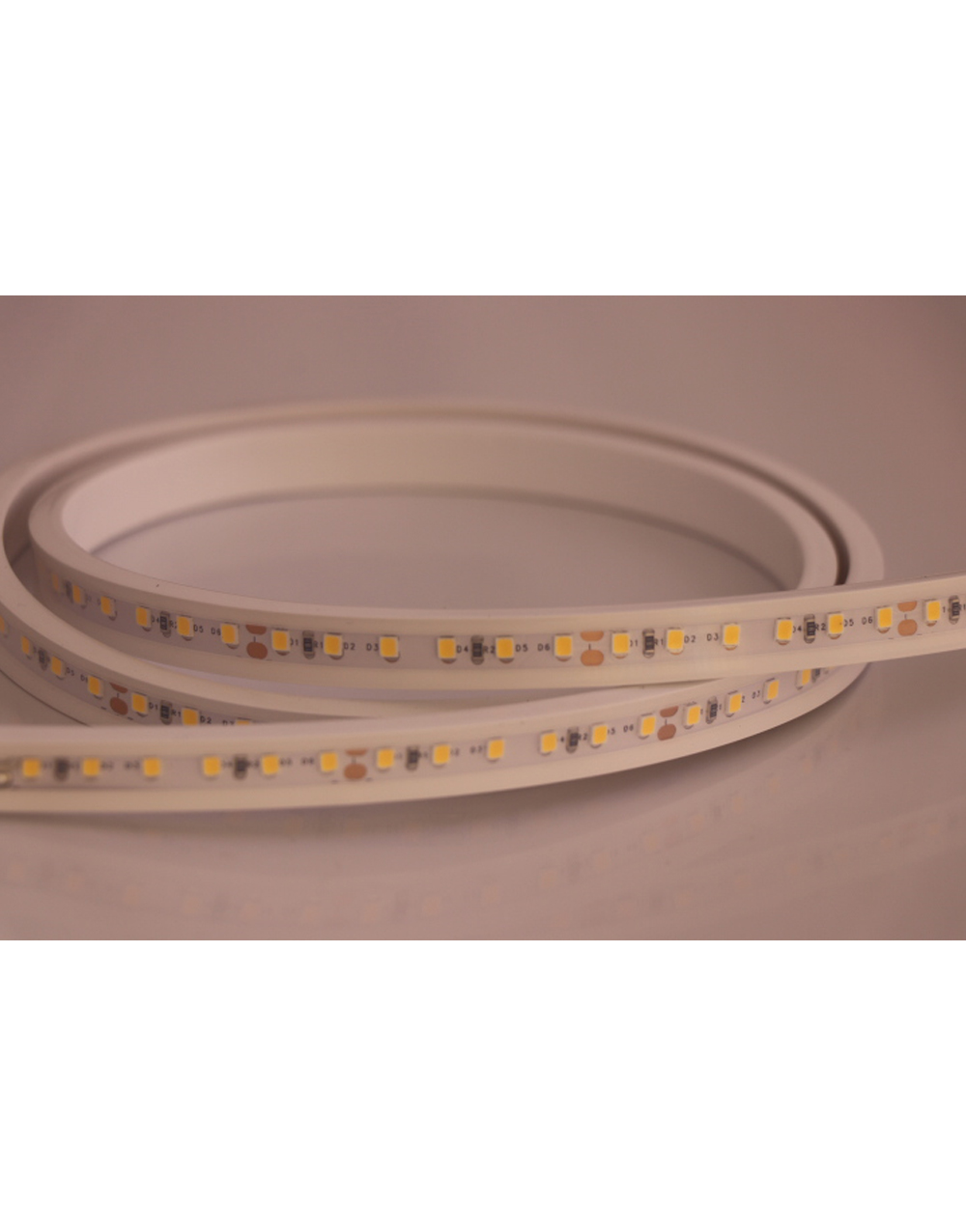 Ταινία LED flat neon flex με τάση τροφοδοσίας 24V και ονομαστική ισχύς ανά μέτρο 11W. Η θερμοκρασία χρώματος είναι 3000K. Ο βαθμός στεγανότητας είναι IP65, η γωνια δέσμης 220 μοίρες και η διάρκεια ζωής της ταινία είναι 35000h. Ο τύπος LED είναι SMD2835 και σε κάθε μέτρο υπάρχουν 120 LED. Τα σημεία κοψίματος της ταινίας βρίσκονται κάθε 5 εκατοστά και ο τρόπος κάμψης της είναι top bending. Η κάθε σακούλα διαθέτει 5 μέτρα ταινίας