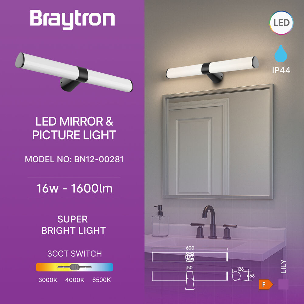 Το BRAYTRON BRY‑LILY‑B‑600‑16W‑3IN1‑BLC IP44 Mirror Lamp αποτελεί μια πρωτοποριακή λύση φωτισμού καθρέπτη που συνδυάζει υψηλή απόδοση, λειτουργικότητα και μοντέρνο design. Με LED ισχύ 16 W και περίπου 1600 lm φωτεινότητα, προσφέρει έντονο αλλά ομοιόμορφο φωτισμό, ιδανικό για μπάνια, vanity areas και χώρους όπου απαιτείται καθαρός, σωστά κατευθυνόμενος φωτισμός.