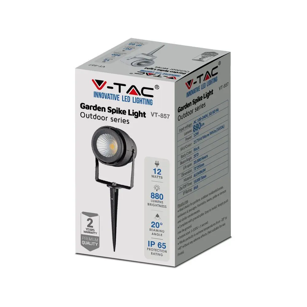 Φωτιστικό κήπου V-Tac VT-857 LED με ισχύ 12W , τεχνολογία COB LED , σώμα και στήριξη από μαύρο αλουμίνιο και διάφανο κάλυμμα. Με γωνία δέσμης 20° και φωτεινή ροή 880 lm . Χάρη στον βαθμό προστασίας IP65 , είναι ιδανικό για εξωτερικό φωτισμό του σπιτιού, ακόμη και κάτω από παρατεταμένη βροχή. Είναι σχεδιασμένο τόσο για εγκατάσταση στο έδαφος όσο και για ταφή με τη χρήση του ειδικού πασσάλου που περιλαμβάνονται στη συσκευασία. Συνδέεται με το δίκτυο μέσω καλωδίων. Είναι επίσης δυνατή η κλίση της πηγής φωτός του κατά 360° .
