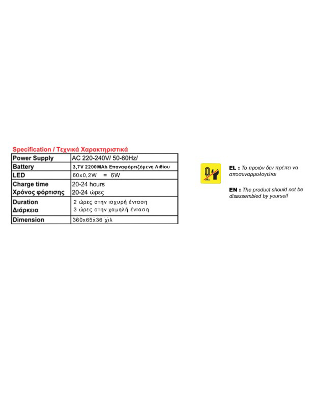 Επαναφορτιζόμενο φωτιστικό LED SMD 6W, με μπαταρία λιθίου (3,7V/2200mAh). Η τάση τροφοδοσίας είναι στα 220-240V και θερμοκρασία χρώματος 6500Κ. Έχει διάρκεια φόρτισης 20-24 ώρες και διάρκεια λειτουργίας 2 ώρες για λειτουργία στην ισχυρή ένταση και 3 ώρες για λειτουργία στην χαμηλή. Ο βαθμός στεγανότητας είναι IP20. Εγγύηση 2 έτη από την Universe.