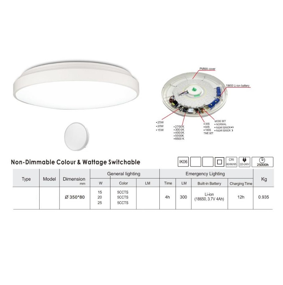 Ισχύς LED: 3 επιλογές 15 W / 20 W / 25 W (~1350-1800‑2250 lm)