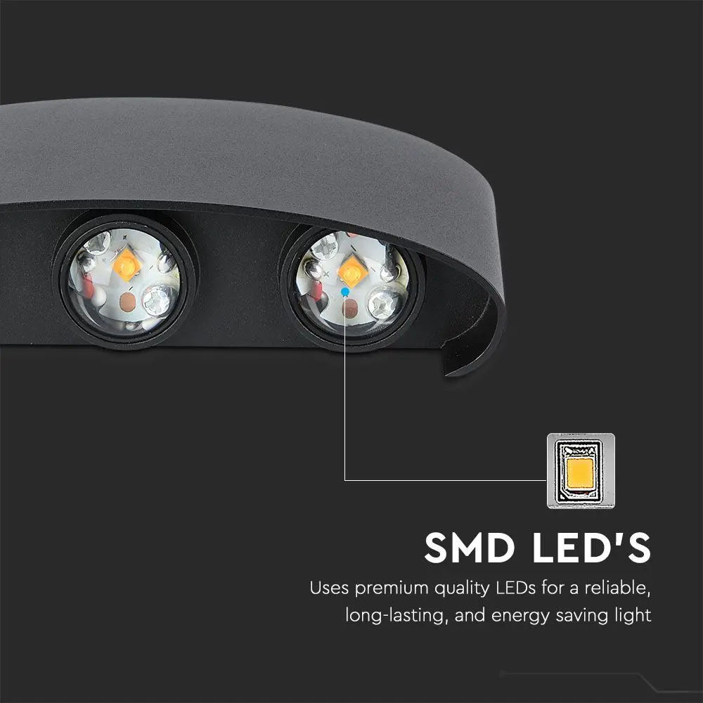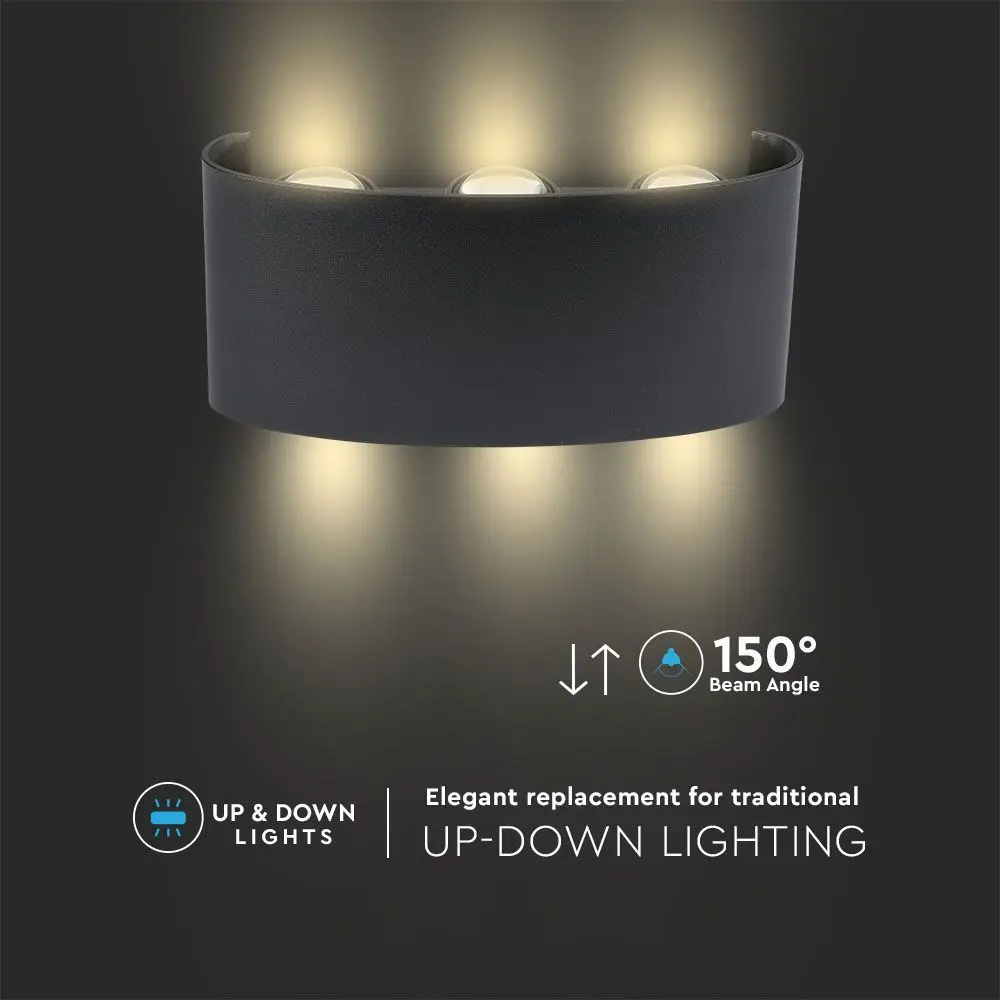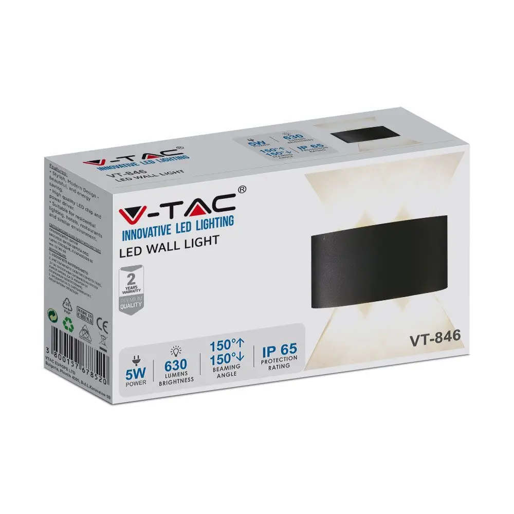 Το V-Tac VT-846 είναι ένα φωτιστικό τοίχου με ισχύ 5W . Είναι εξοπλισμένο με 6 πηγές φωτός με τεχνολογία SMD LED που καλύπτονται με διάφανο κάλυμμα. Το κομψό μακρόστενο σχήμα του είναι κατασκευασμένο από μαύρο αλουμίνιο . Με γωνία διπλής δέσμης 150° και φωτεινή ροή 630 lm . Χάρη στον βαθμό προστασίας IP65, είναι ιδανικό για εξωτερική χρήση ακόμα και σε παρατεταμένη βροχή. Οι πηγές φωτός είναι διατεταγμένες σε σειρές των 3 η μία τοποθετημένη στο πάνω μέρος του λαμπτήρα και η άλλη στο κάτω. Στη συσκευασία θα παραλάβετε τις βίδες για την τοποθέτηση στον τοίχο, ένα κλειδί Allen και έναν βιδωτό ακροδέκτη για τη σύνδεση των καλωδίων.