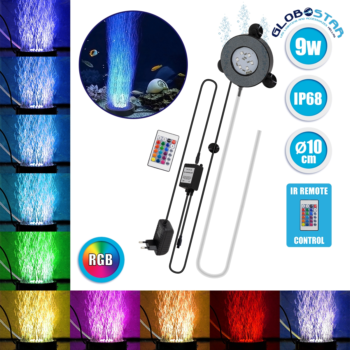 Το GloboStar® 79683 Φωτιστικό Ενυδρείου & Οξυγονωτής / Μηχανισμός Φυσαλίδων Φ10cm LED 9W 180° AC 230V Αδιάβροχο IP68 με Ασύρματο Χειριστήριο IR Πολύχρωμο RGB περιέχει 3 βεντούζες για την εύκολη τοποθέτηση του.