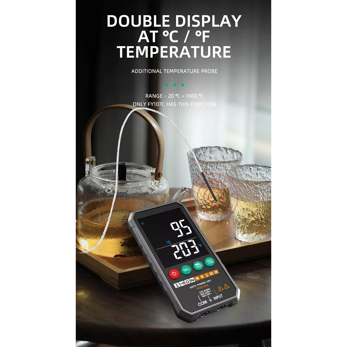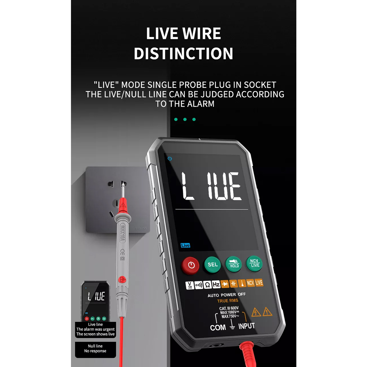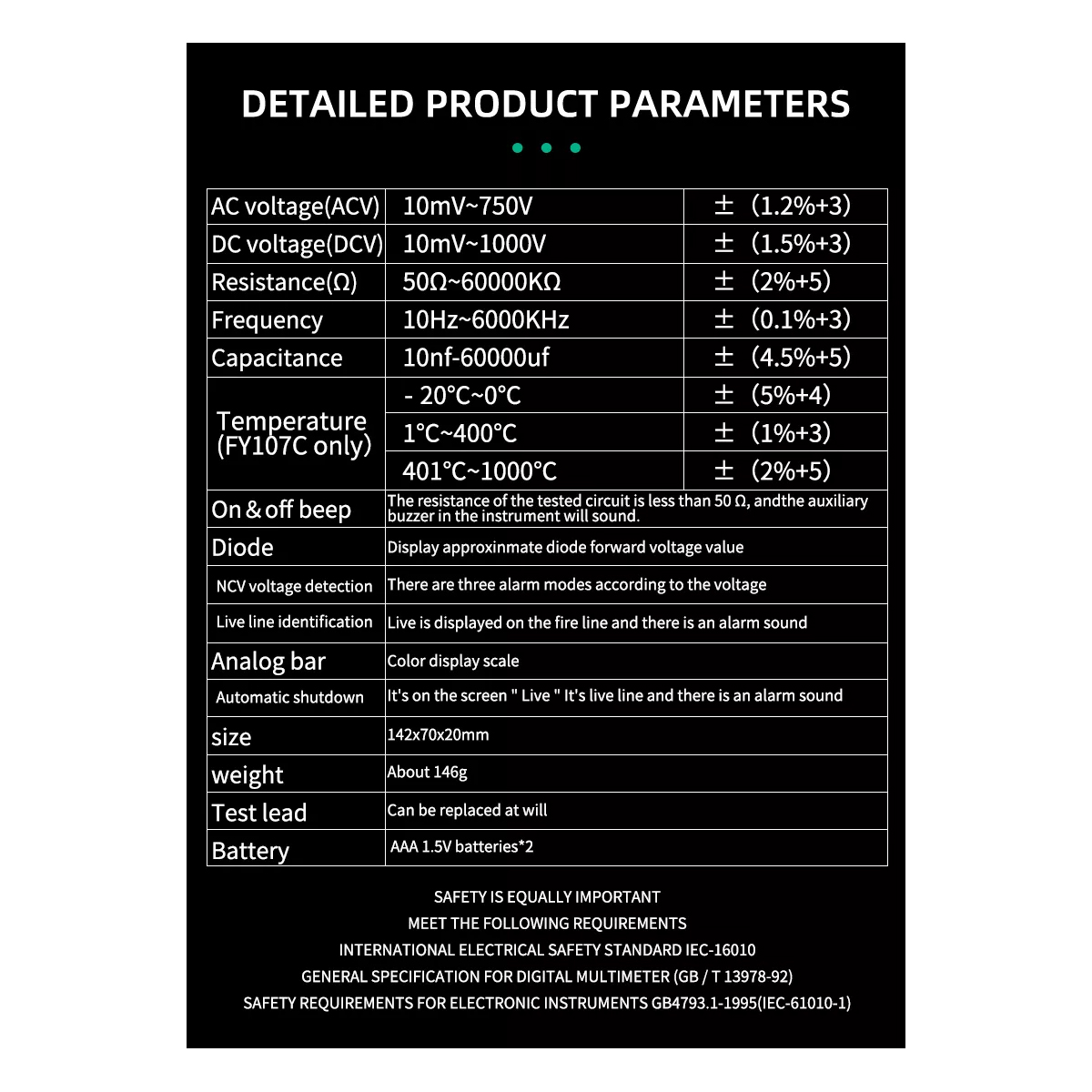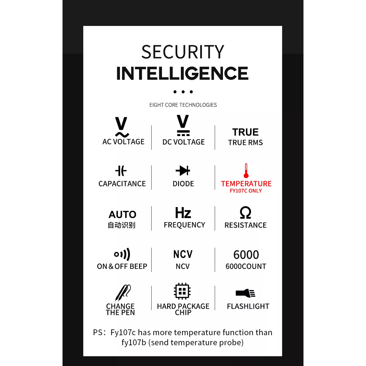 Functions – Λειτουργίες : AC Voltage, DC Voltage, Resistance, Conduction, Frequency, NCV, Live Wire Check, Data Hold, Backlight, Torch, Diode, Capacitance, Temperature