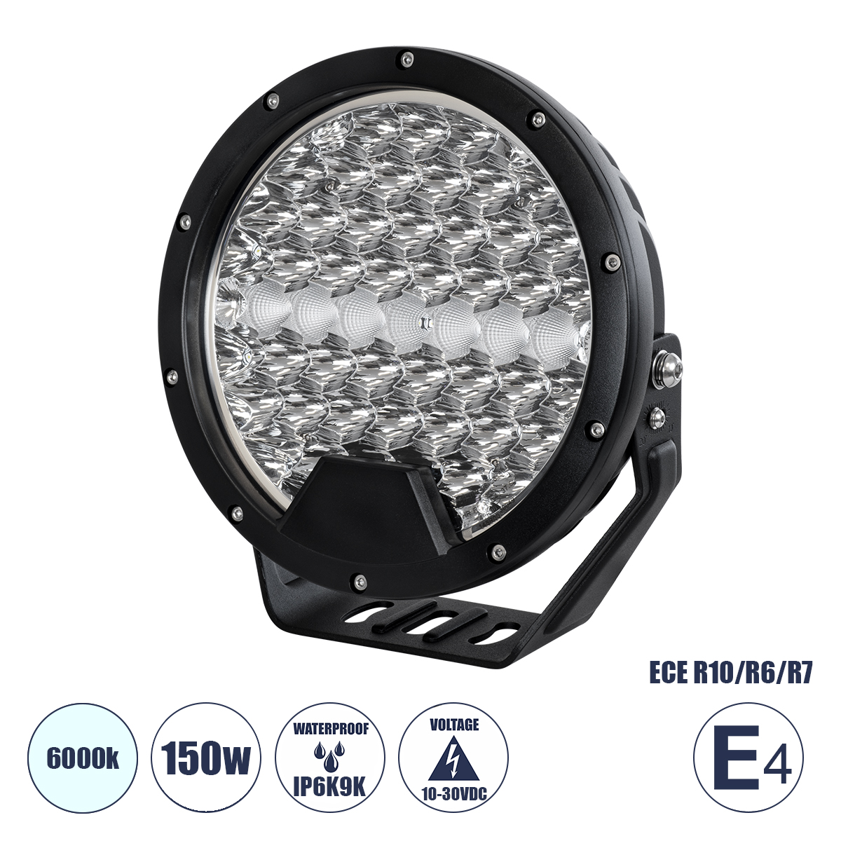 GloboStar® 85337 E4 Mark Vehicle & JEEP Work Lights – Φώτα Εργασίας για Οχήματα και JEEP LED High Power 150W DC 10-30V Αδιάβροχo IP6K9K Ψυχρό Λευκό 6000K M22 x Π7 x Υ23.5cm