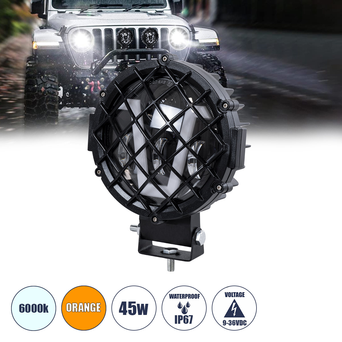 GloboStar® 85439 Vehicle & JEEP Work Lights – Φώτα Εργασίας για Οχήματα και JEEP με V Light DRL & Φλας LED High Power 45W DC 9-36V Αδιάβροχo IP67 Πορτοκαλί & Ψυχρό Λευκό 6000K M17 x Π8 x Υ21cm