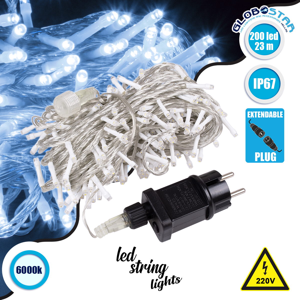 GloboStar® 85837 Διακοσμητική Γιρλάντα 23 Μέτρα με Controller 8 Προγραμμάτων Εναλλαγών Φωτισμού – Επεκτεινόμενη 200 LED 12W AC 230V με Διάφανο Καλώδιο & Πρίζα Schuko Αδιάβροχη IP67 Ψυχρό Λευκό 6000K Μ23m