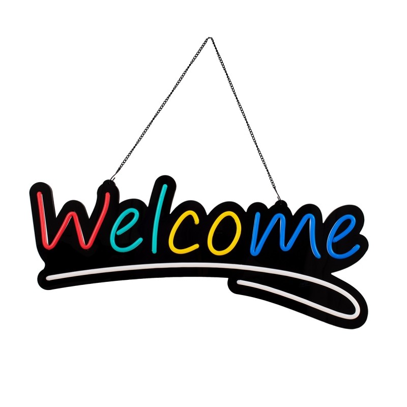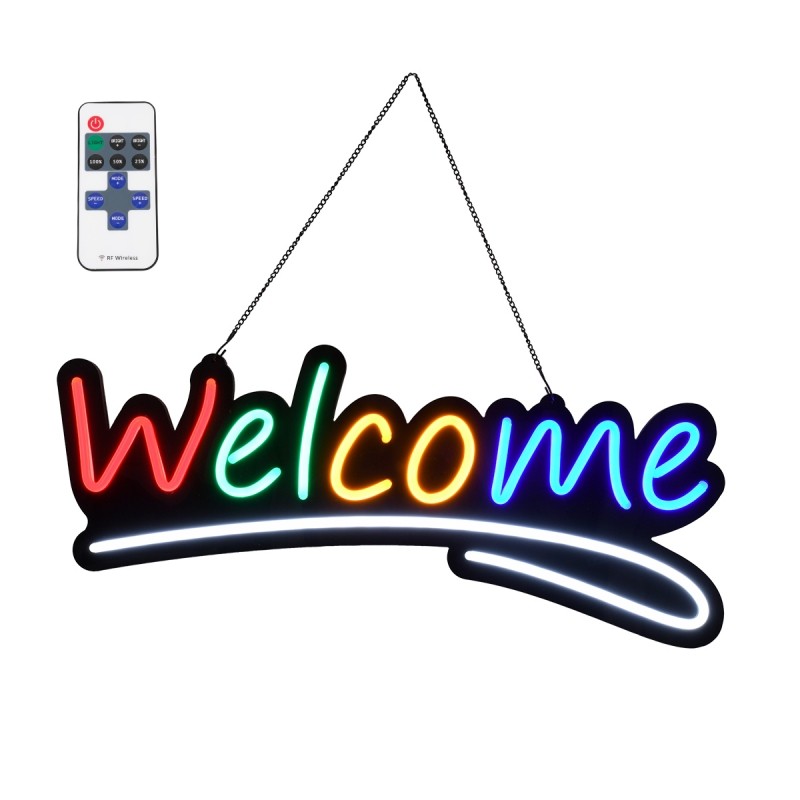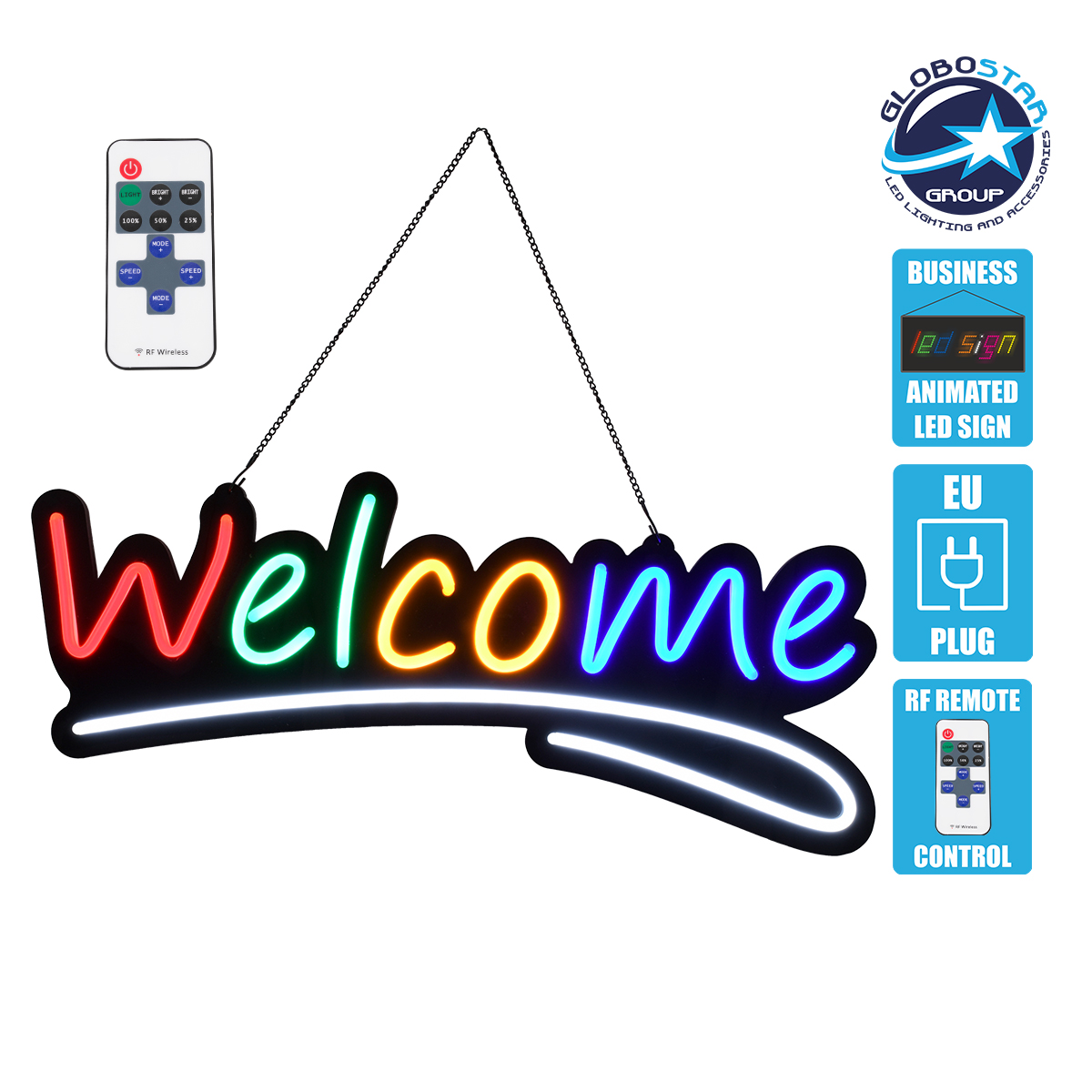 GloboStar® 85861 Φωτιστικό Ταμπέλα Φωτεινή Επιγραφή NEON LED Σήμανσης Animated WELCOME 30W AC 230V με Διακόπτη On/Off και Ασύρματο Χειριστήριο IR Κόκκινο – Πράσινο – Κίτρινο – Μπλε – Λευκό