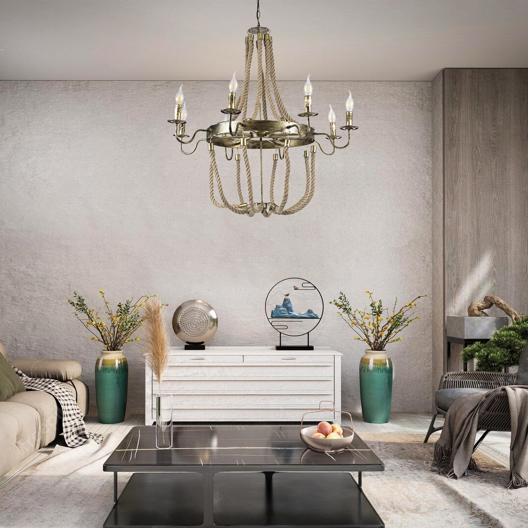 GloboStar® BAVARIAN 01405 Vintage Κρεμαστό Φωτιστικό Οροφής Πολύφωτο 8 x E14 Μπρούτζινο Σκουριά Μεταλλικό Πολυέλαιος με Μπεζ Σχοινί Φ87 x Υ80cm