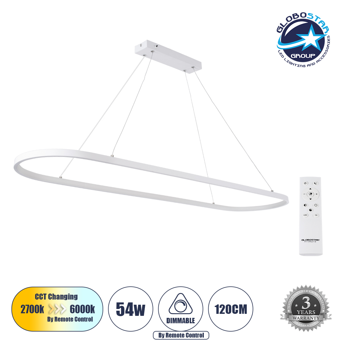 GloboStar® BOLIVAR 61272 Κρεμαστό Φωτιστικό Οροφής Design LED CCT 54W 6210lm 300° AC 220-240V – Εναλλαγή Φωτισμού μέσω Τηλεχειριστηρίου All In One Ψυχρό 6000k+Φυσικό 4500k+Θερμό 2700k Dimmable Μ120 x Π30 x Υ2cm – Λευκό – 3 Years Warranty