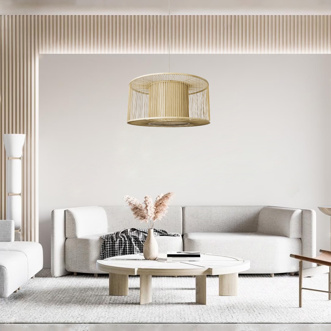 GloboStar® COCONUT 01936 Boho Κρεμαστό Φωτιστικό Οροφής Μονόφωτο 1 x E27 AC220-240V IP20 – Φ80 x Υ38cm – Μπεζ Ξύλινο Πλέγμα – 5 Years Warranty