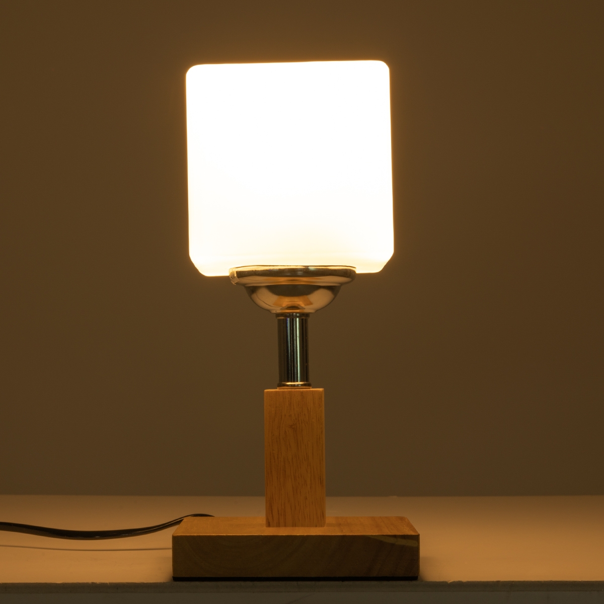 GloboStar® COVE 02037 Μοντέρνο Επιτραπέζιο Φωτιστικό Μονόφωτο 1 x E27 AC220-240V IP20 – Μ12 x Π12 x Υ25cm – Μπεζ Ξύλινο & Γυάλινο Γαλακτερό Κύβο – 5 Χρόνια Εγγύηση