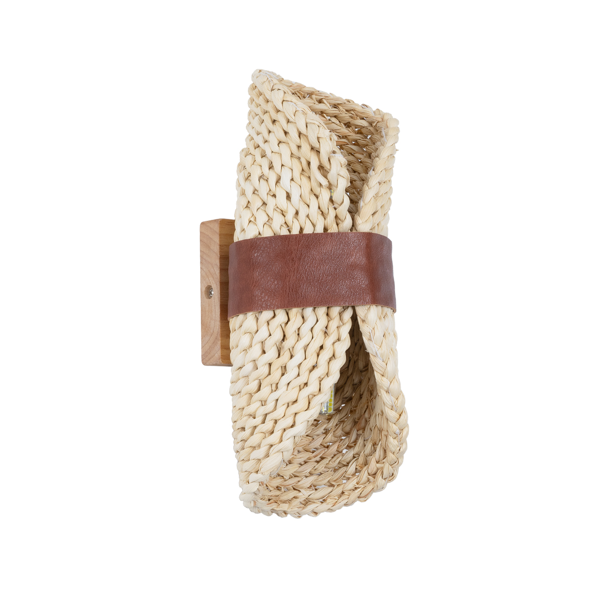GloboStar® GUAVA 02385 Boho Φωτιστικό Τοίχου – Απλίκα Δίφωτο 2 x G9 AC220-240V IP20 – Μ11 x Π13 x Υ30cm – Μπεζ Ξύλινο Μπαμπού Πλέγμα με Καφέ Δέρμα