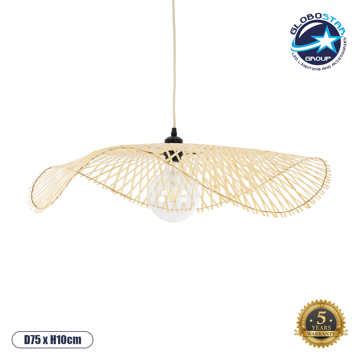 GloboStar® MELEMELE 01841 Boho Κρεμαστό Φωτιστικό Οροφής Μονόφωτο 1 x E27 AC220-240V IP20 – Φ75 x Υ10cm – Μπεζ Ξύλινο Μπαμπού Πλέγμα – 5 Χρόνια Εγγύηση