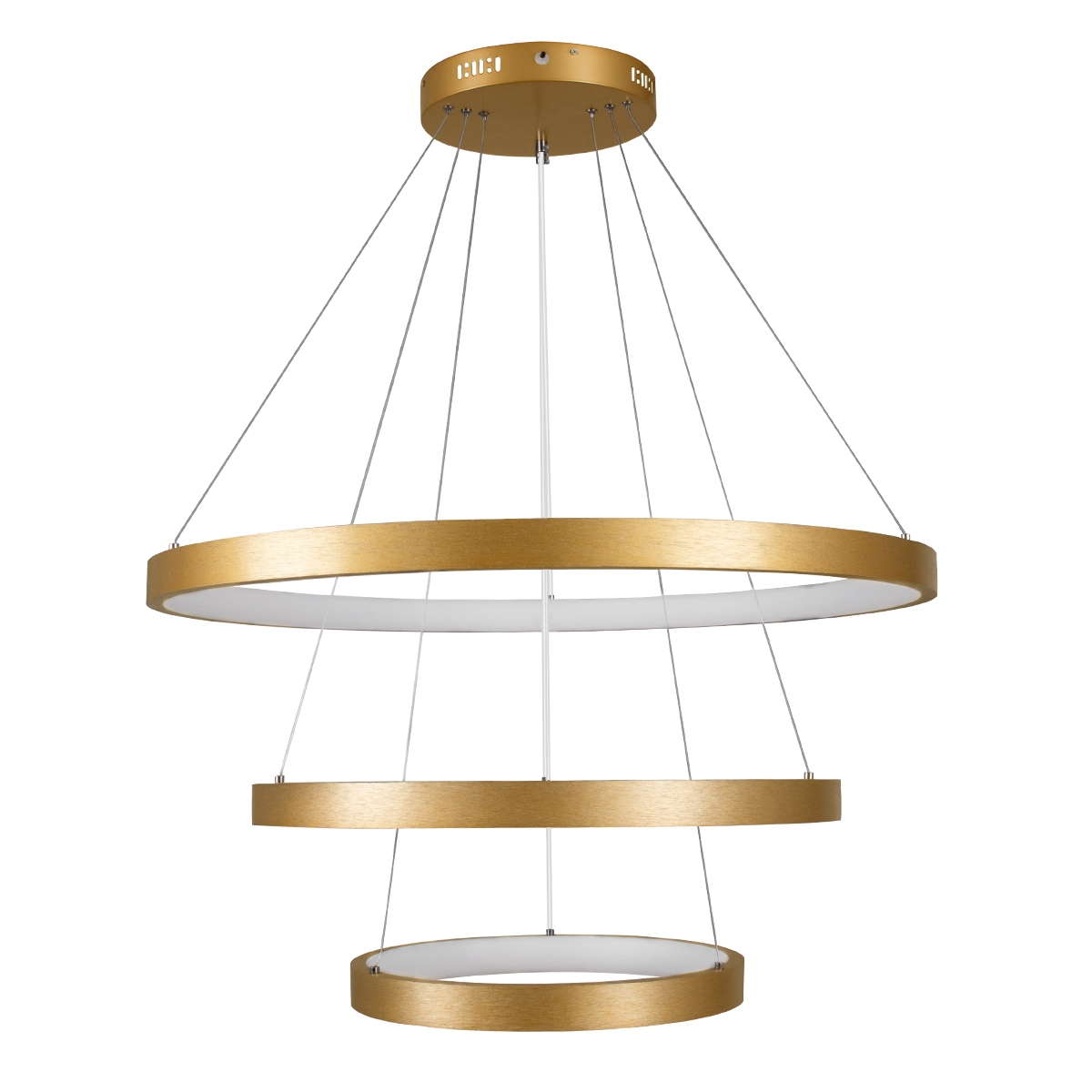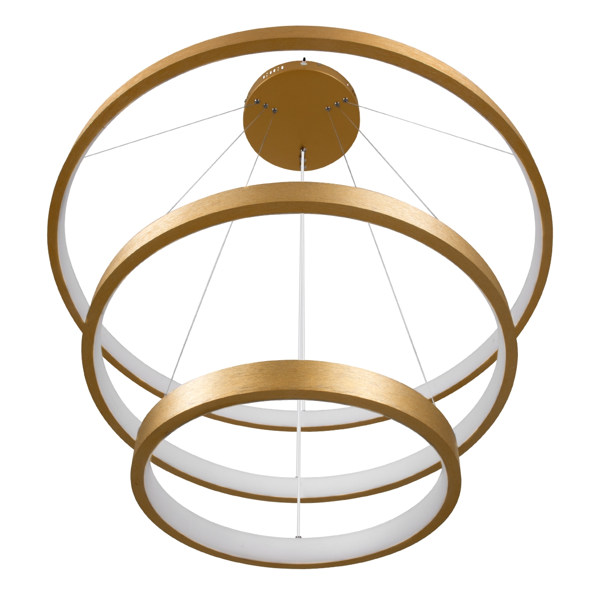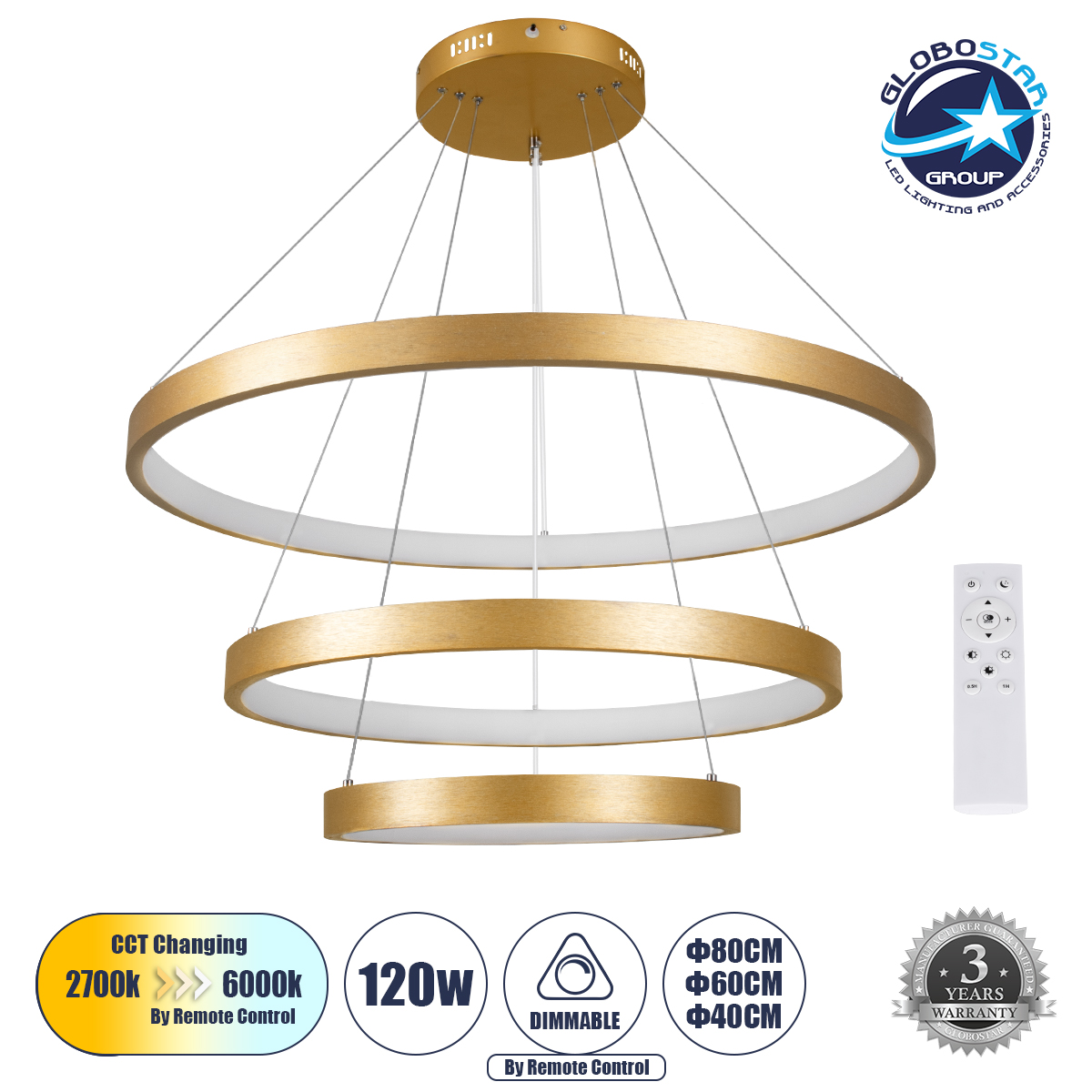GloboStar® NEMESIS TRIO 61172 Κρεμαστό Φωτιστικό Δαχτυλίδι-Κύκλος LED CCT 120W 14723lm 360° AC 220-240V – Εναλλαγή Φωτισμού μέσω Τηλεχειριστηρίου All In One Ψυχρό 6000k+Φυσικό 4500k+Θερμό 2700k Dimmable Φ40+60+80cm – Χρυσό Βούρτσας – 3 Years Warranty
