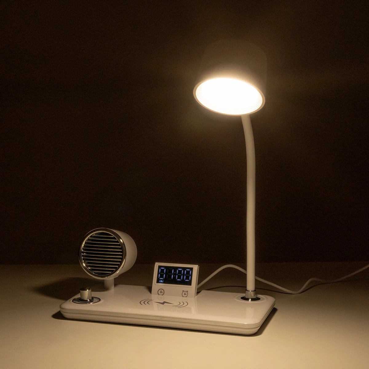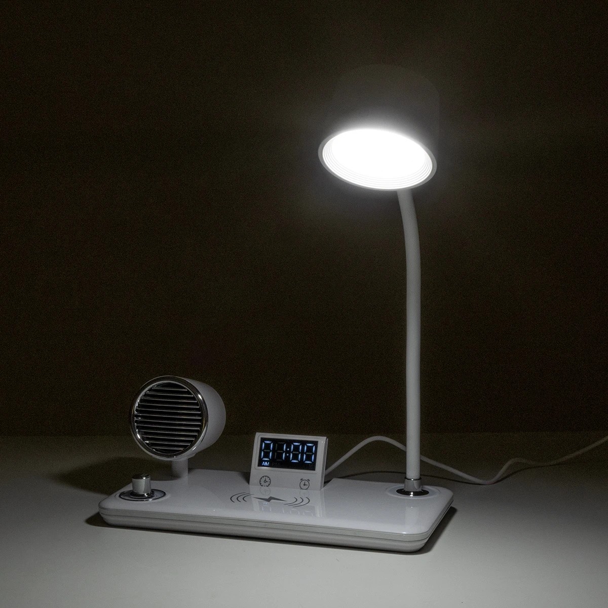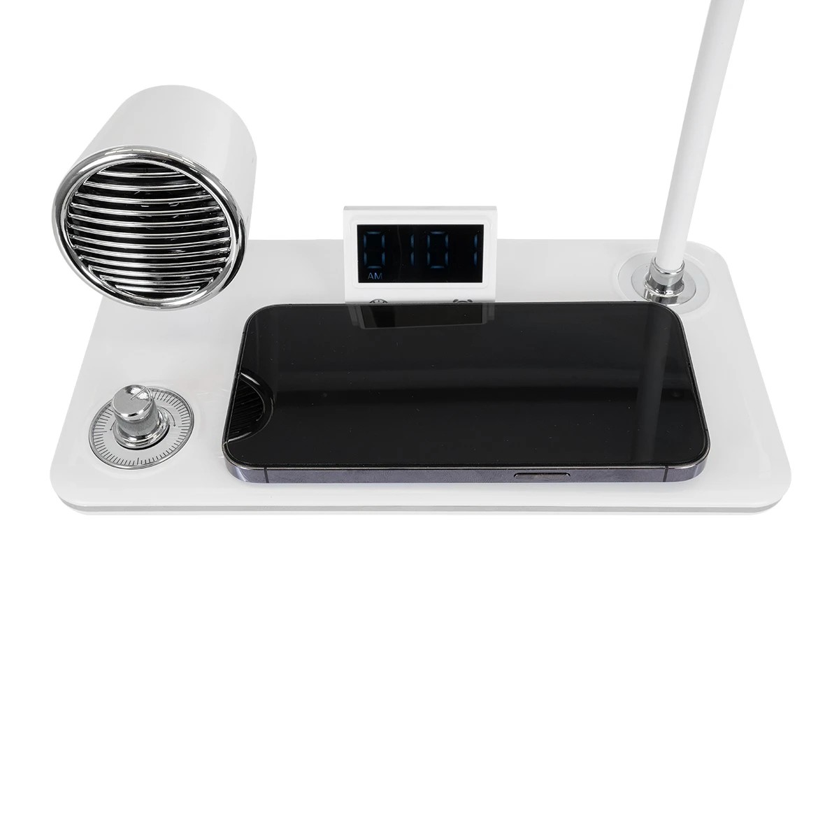 GLOBOSTAR® OLDY 76557 Μοντέρνο Επιτραπέζιο Φωτιστικό Γραφείου με Ασύρματη Φόρτιση 15W 3A, 5W Bluetooth Ηχείο & Ψηφιακό Ρολόι LED 3W 300lm 120° DC 5V με USB-C IP20 Ρυθμιζόμενο Λευκό CCT με Αφή 2700K/4500K/6000K Dimmable – Sanan SMD Chip – Λευκό – Μ13 x Π25 x Υ43cm – 2 Χρόνια Εγγύηση