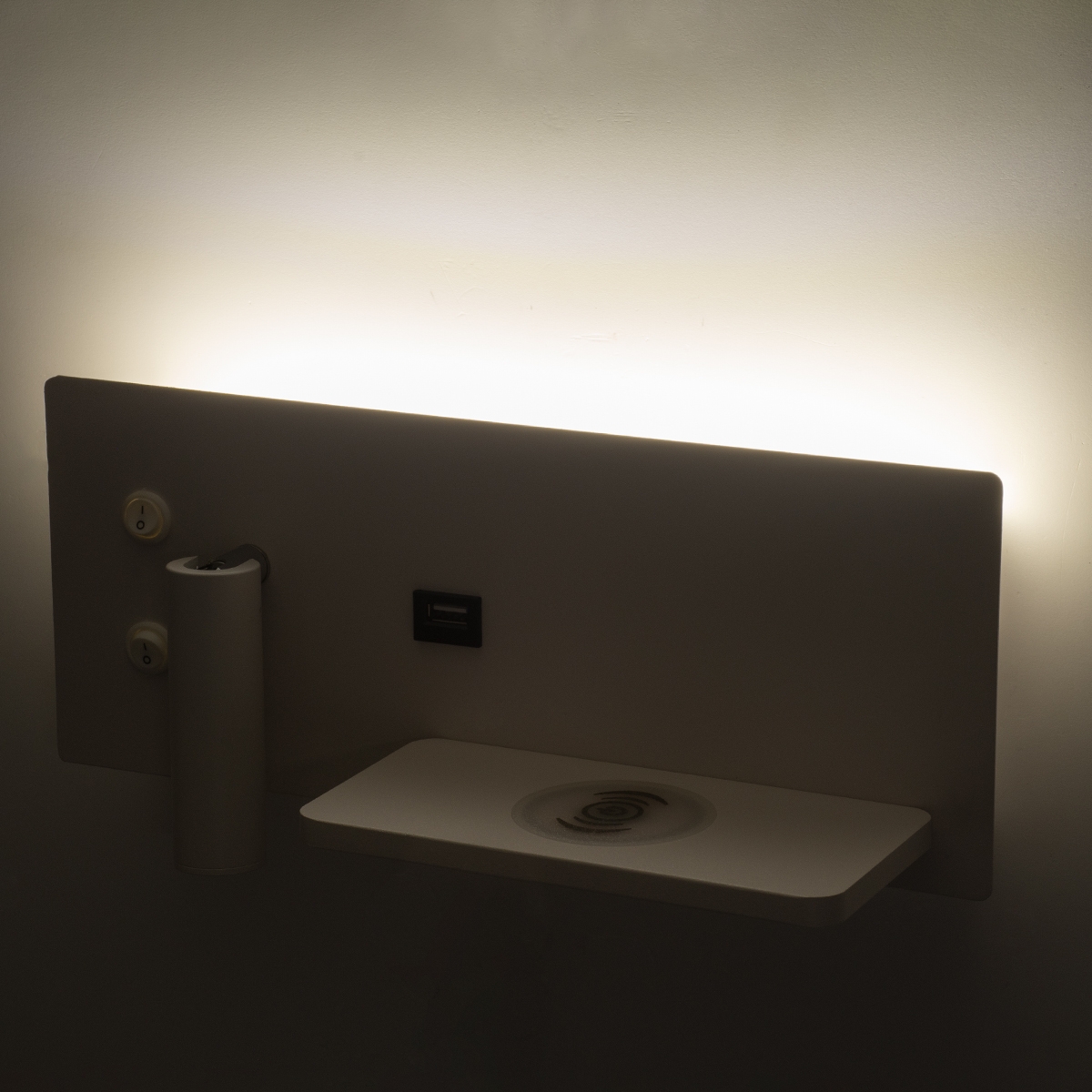 GloboStar® PALADIN 61354 Μοντέρνο Φωτιστικό Τοίχου – Απλίκα Ξενοδοχείου Bed Side LED 6W 720lm 36° AC 220-240V – Reading Light & Κρυφός Φωτισμός – Φορτιστές USB 3A & Wireless 20W – Μ30 x Π11 x Υ12cm – Φυσικό Λευκό 4500K – Λευκό – Δεξί