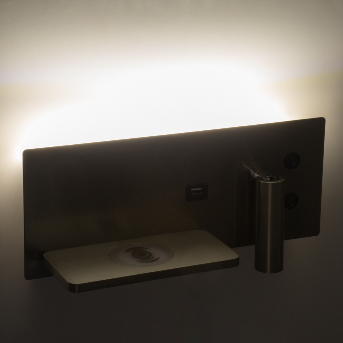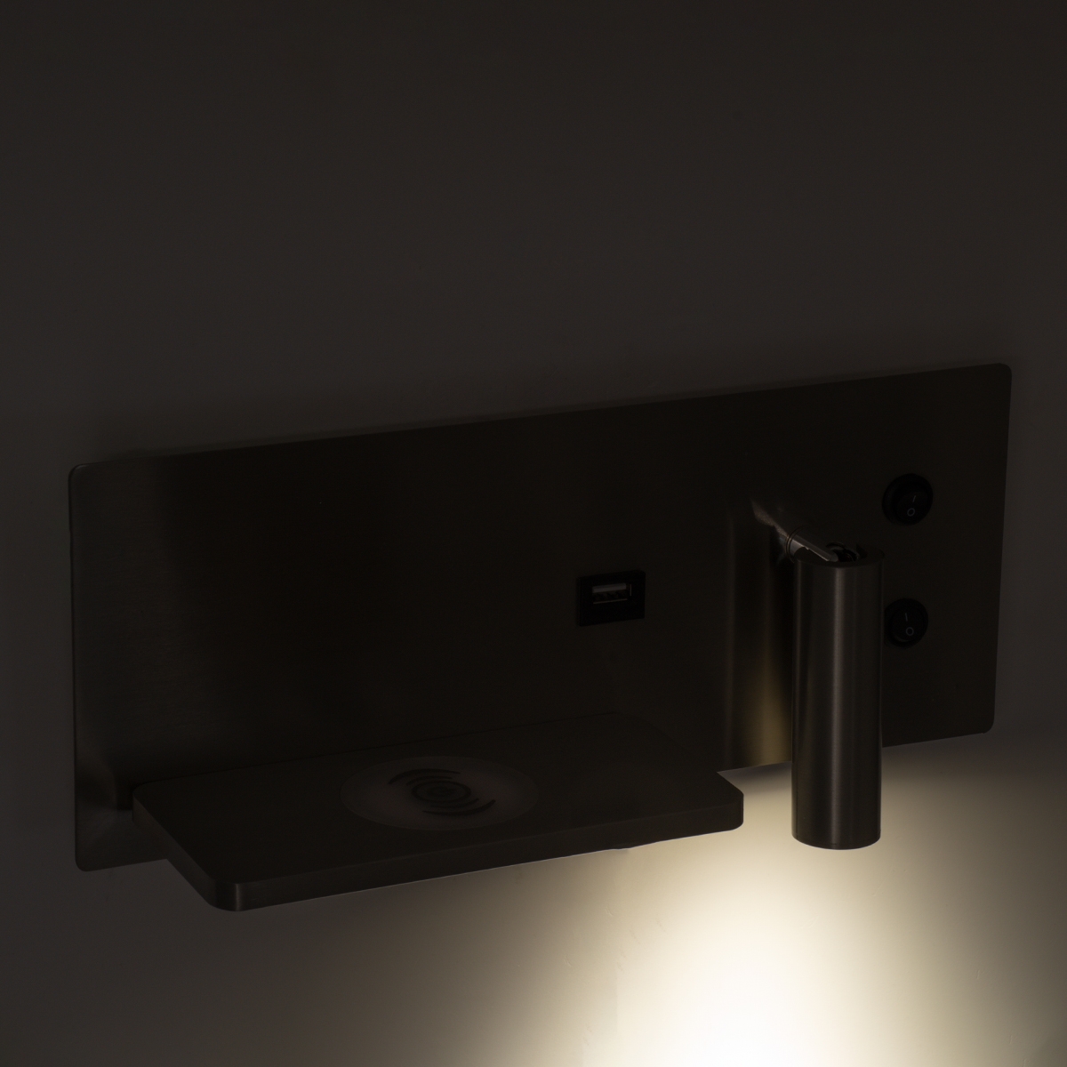GloboStar® PALADIN 61355 Μοντέρνο Φωτιστικό Τοίχου – Απλίκα Ξενοδοχείου Bed Side LED 6W 720lm 36° AC 220-240V – Reading Light & Κρυφός Φωτισμός – Φορτιστές USB 3A & Wireless 20W – Μ30 x Π11 x Υ12cm – Φυσικό Λευκό 4500K – Νίκελ Βούρτσας – Αριστερό