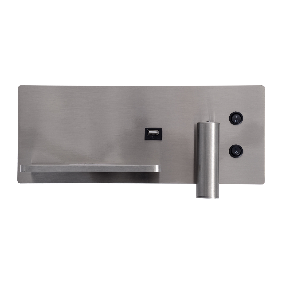 GloboStar® PALADIN 61355 Μοντέρνο Φωτιστικό Τοίχου - Απλίκα Ξενοδοχείου Bed Side LED 6W 720lm 36° AC 220-240V - Reading Light & Κρυφός Φωτισμός - Φορτιστές USB 3A & Wireless 20W - Μ30 x Π11 x Υ12cm - Φυσικό Λευκό 4500K - Νίκελ Βούρτσας - Αριστερό