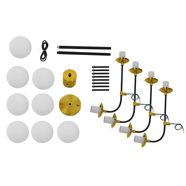 - Χρώμα Φωτιστικού: Μαύρο – Χρυσό με Γυάλινες Λευκές Ματ Μπάλες