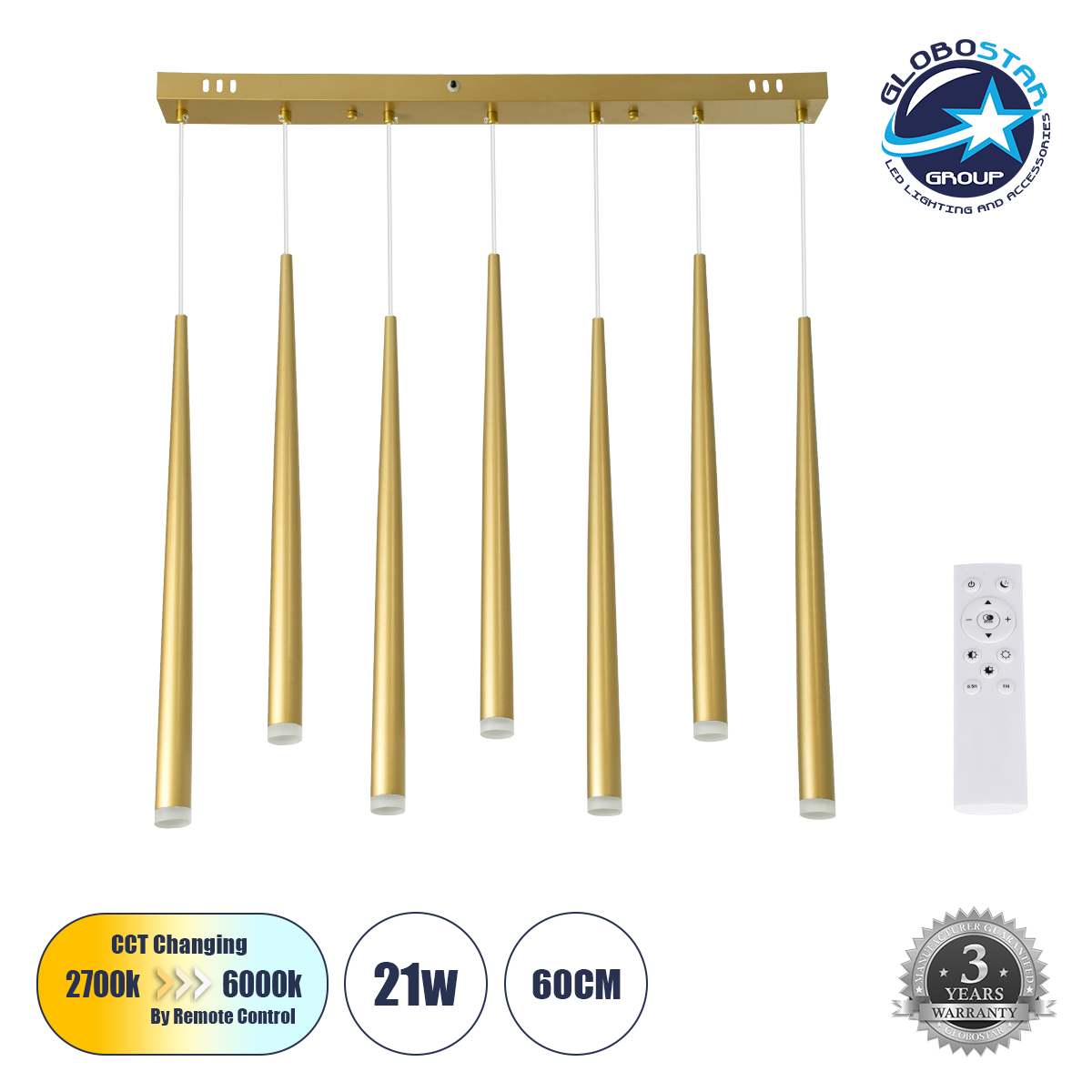 GloboStar® TEARS 61312 Κρεμαστό Φωτιστικό Οροφής Design LED CCT 21W 2310lm 180° AC 220-240V – Εναλλαγή Φωτισμού μέσω Τηλεχειριστηρίου All In One Ψυχρό 6000k+Φυσικό 4500k+Θερμό 2700k Dimmable Μ70 x Π3.2 x Υ60cm – Χρυσό Βούρτσας – 3 Years Warranty