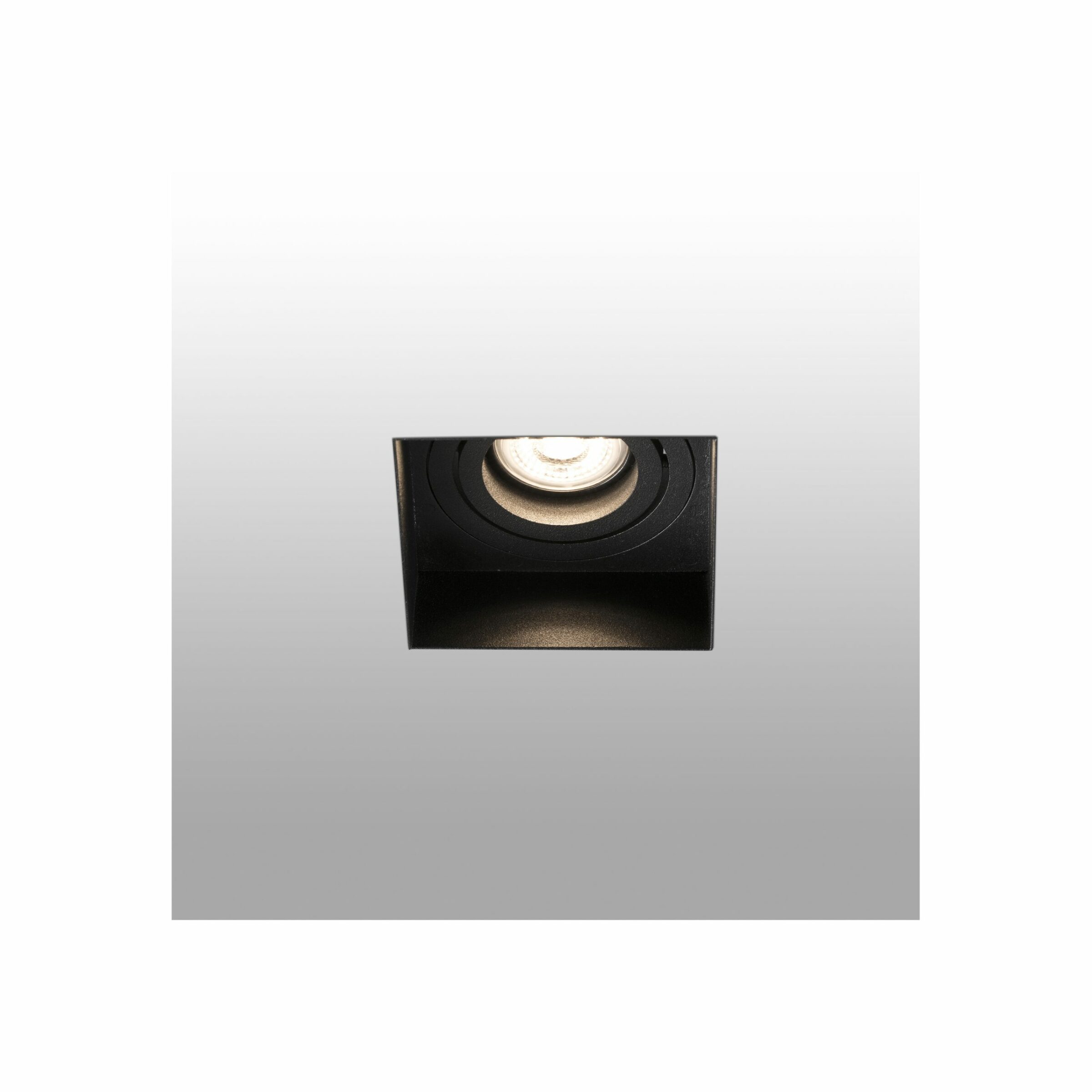 Square recessed light with simple design, enabling it to be discreetly integrated into the ceiling. This downlight has IP44 and is orientable. Finished in black and without frame.