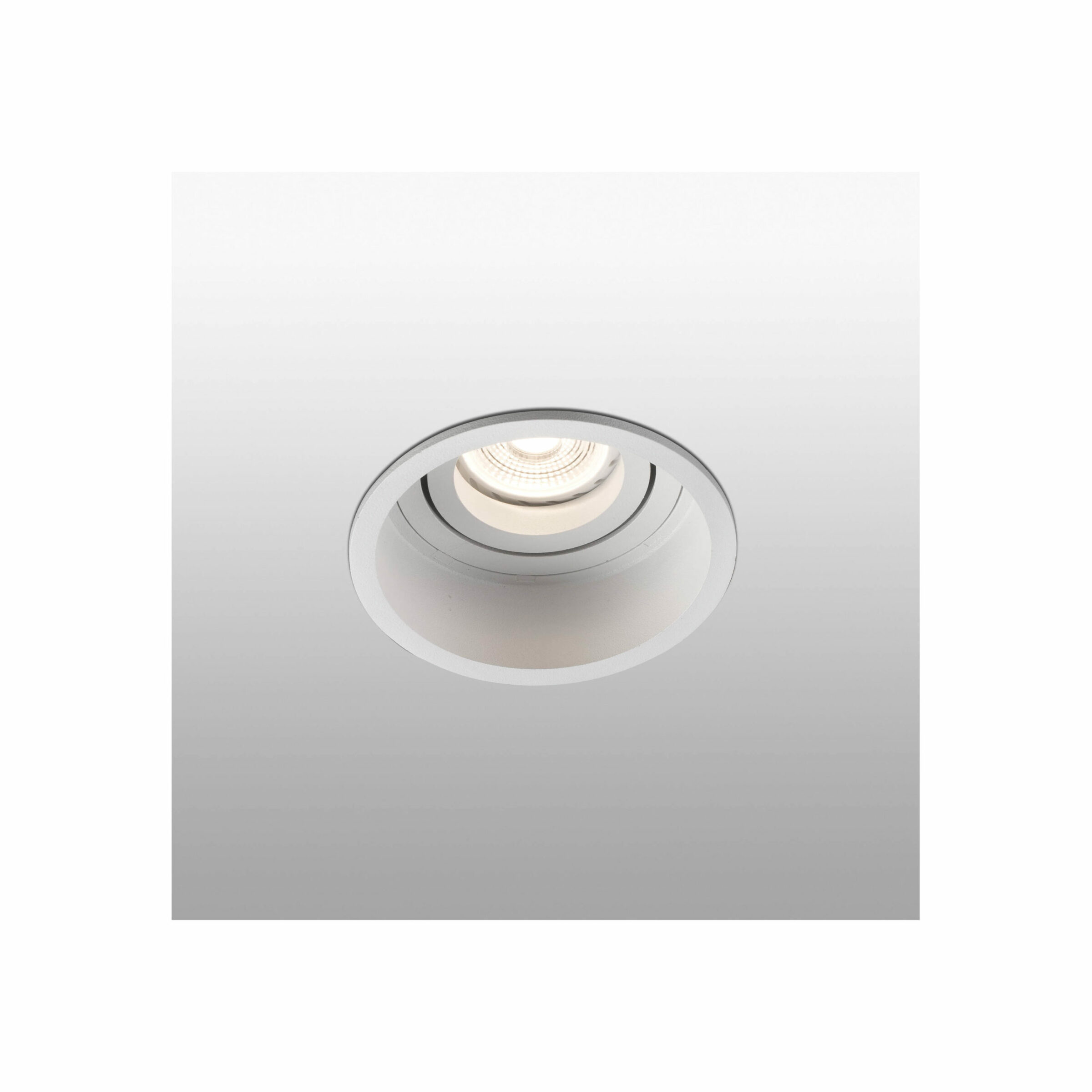 Round recessed light with simple design, enabling it to be discreetly integrated into the ceiling. This downlight has IP20 and is orientable. Finished in white.