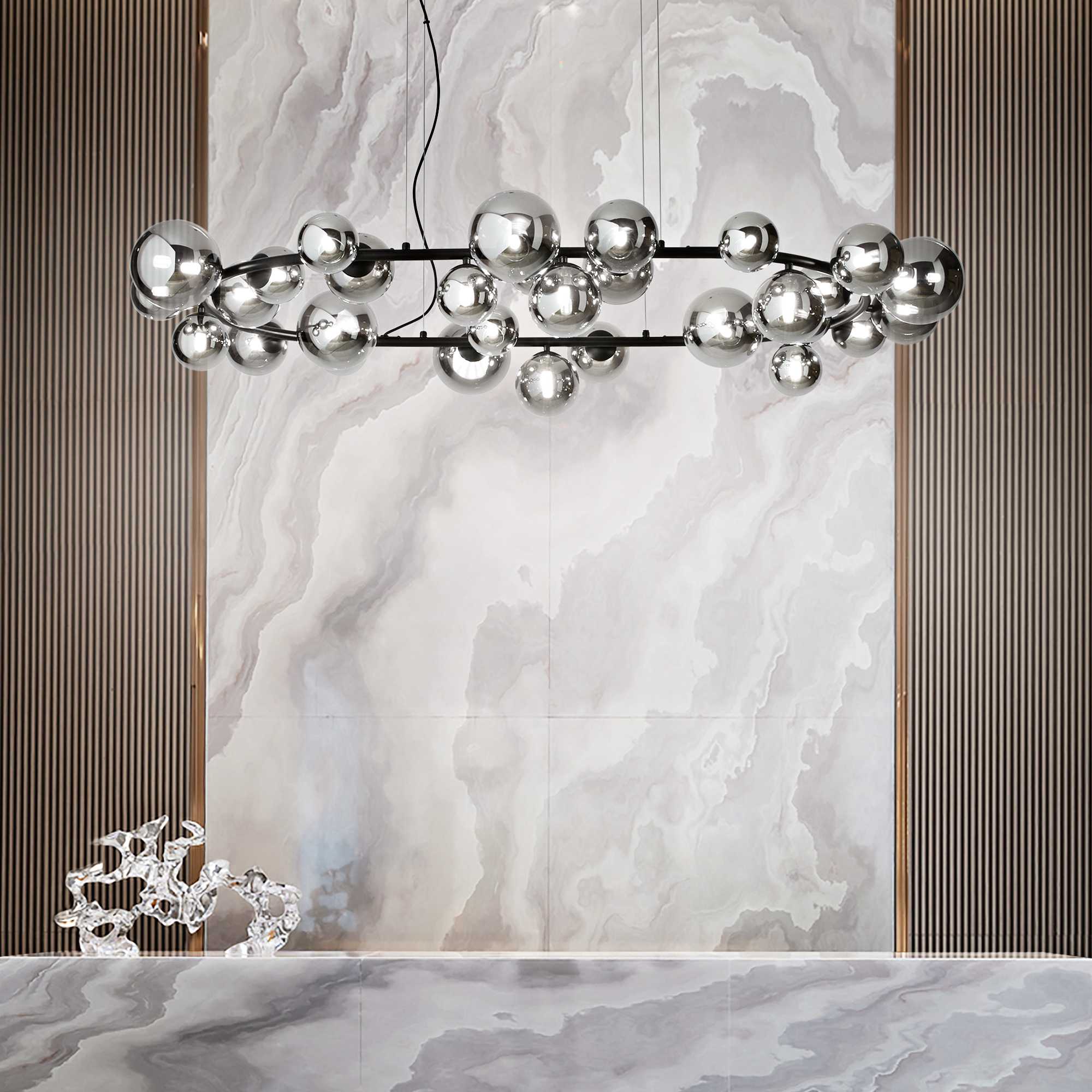 Μεταλλικός σκελετός με γραμμική δομή με στρογγυλή τομή ή κυκλικός με τετράγωνη τομή. Διαχυτές φυσητού γυαλιού. Φινιρίσματα: μαύρο ματ και καπνιστό γυαλί Pyrex ή σατέν ορείχαλκος με χαραγμένο λευκό γυαλί ή πορτοκαλί γυαλί.