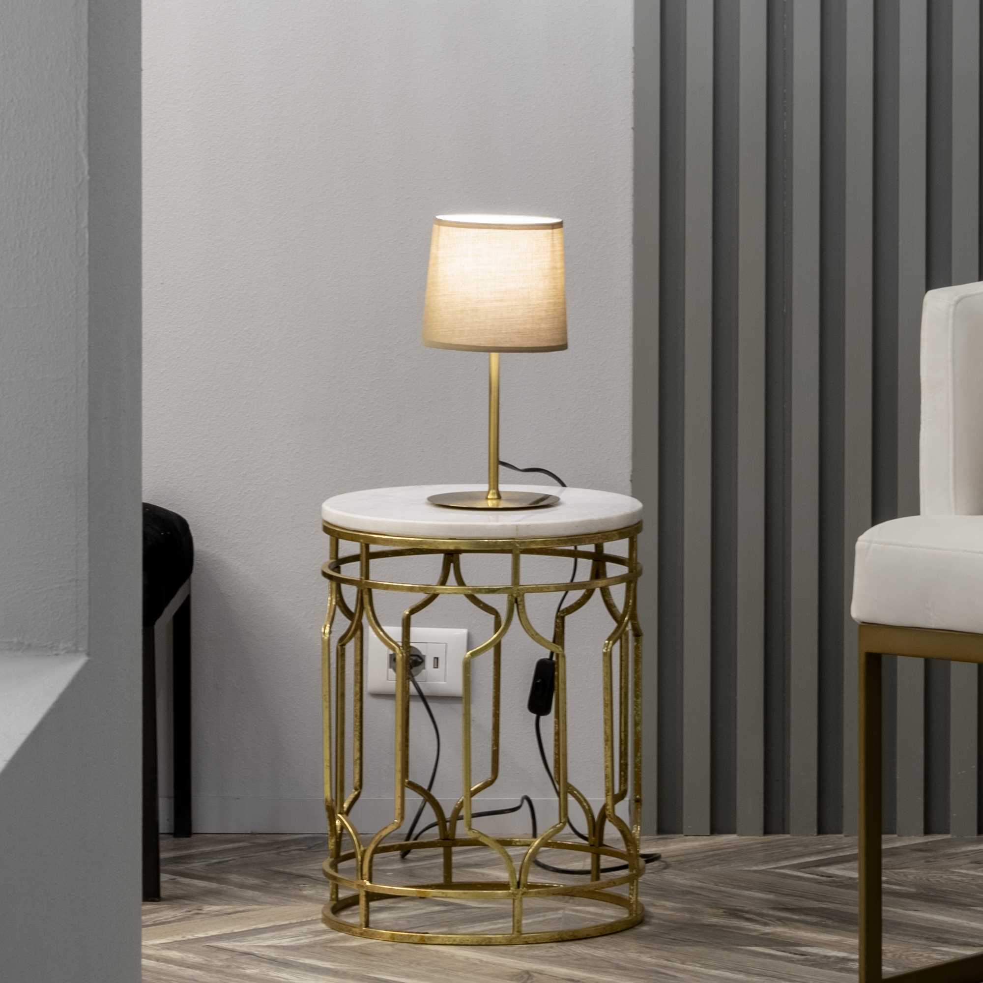 Μεταλλικοί σκελετοί με επίστρωση ή επίστρωση πούδρας. Αμπαζούρ από πυρίμαχο PVC ντυμένο με ύφασμα. Χρώματα πλαισίου: λευκό, μαύρο ή σατέν νίκελ ή βουρτσισμένο ορείχαλκο. Χρώματα αμπαζούρ: μπεζ, γκρι περιστεριού, λευκό ή μαύρο.