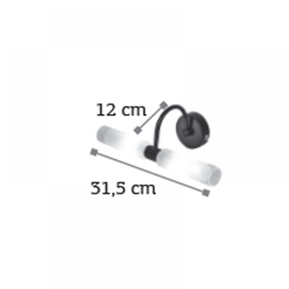 Πρόκειται για ένα επιτοίχιο φωτιστικό κατασκευασμένο από μέταλλο σε μαύρη απόχρωση με δύο λαμπτήρες που καλύπτονται από κυλινδρικό γυαλί αμμοβολής με διάφανες λεπτομέρειες. Είναι η ιδανική επιλογή για φωτισμό μπάνιου τοποθετημένο πάνω από τον καθρέπτη αφού το φως διαχέεται ομοιόμορφα.