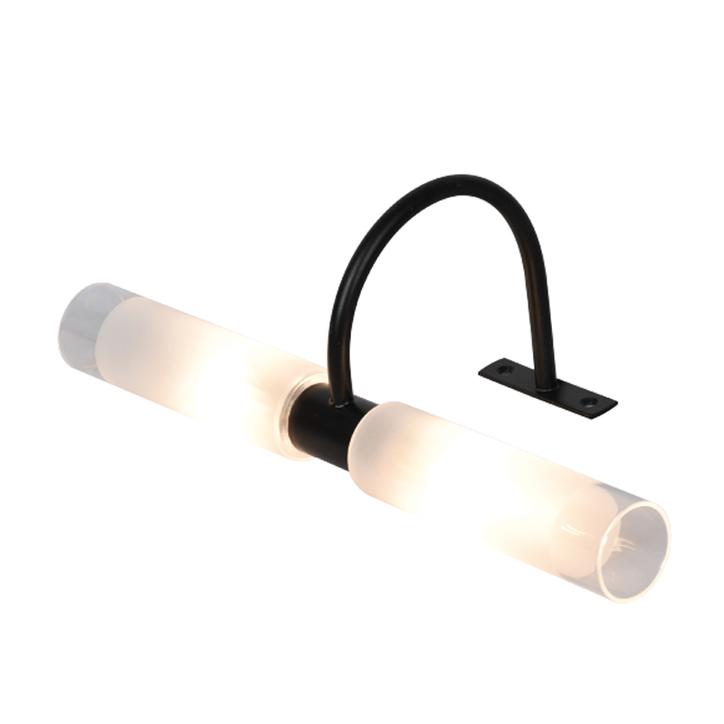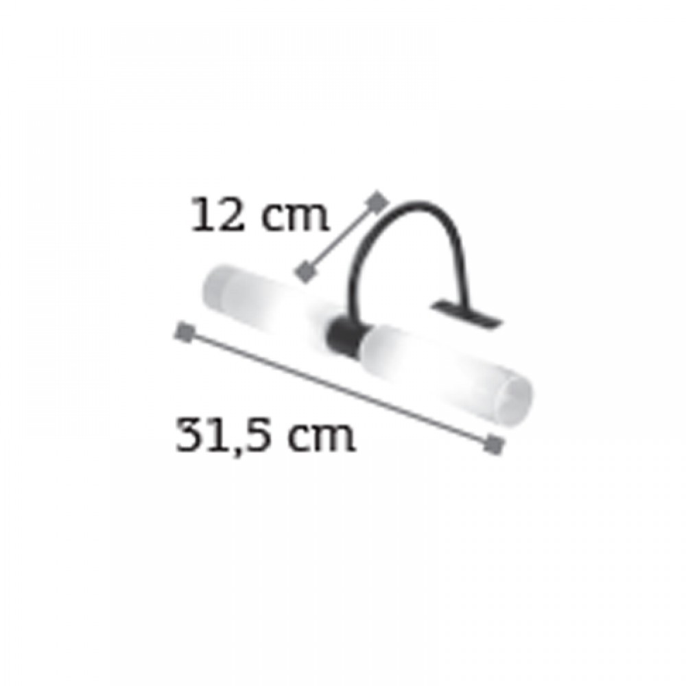Πρόκειται για ένα επιτοίχιο φωτιστικό κατασκευασμένο από μέταλλο σε μαύρη απόχρωση με δύο λαμπτήρες που καλύπτονται από κυλινδρικό γυαλί αμμοβολής με διάφανες λεπτομέρειες. Είναι η ιδανική επιλογή για φωτισμό μπάνιου τοποθετημένο πάνω από τον καθρέπτη και όταν υπάρχει έλλειψη χώρου για την βάση του. Το φως διαχέεται ομοιόμορφα.